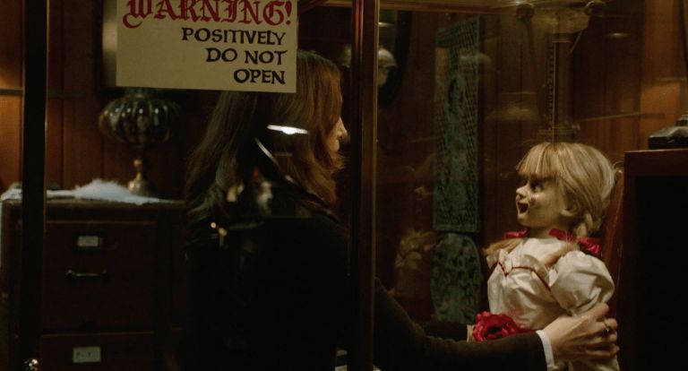 Determined to keep Annabelle from wreaking more havoc, demonologists Ed and Lorraine Warren bring the possessed doll to the locked artifacts room in their home, placing her "safely" behind sacred glass and enlisting a priest's holy blessing. But an unholy night of horror awaits as Annabelle awakens the evil spirits in the room, who all set their sights on a new target—the Warrens' ten-year-old daughter, Judy, and her friends.