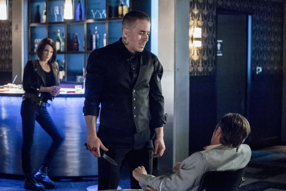 Diaz and Laurel go back to Cartier's club, take out his men and force him to tell them where and when the next Quadrant meeting was… conveniently that very evening… Diaz then goes to the meeting and sends Cartier in with C-4 strapped to him and he blows up, taking out part of the guards with Laurel's sonic scream doing a number on the rest. Diaz follows in an brutally kills a few people. He then goes into the meeting room, surrounded by guards and makes his pitch. Eric Cartier Sr. (J. Douglas Stewart) if, of course, pissed because Diaz killed his son and refuses to work with the 'street trash'. The others listen to his offer, but point out that there are no empty seats at the table. Diaz kills the older Cartier and takes his seat so they can talk business. We then see him wearing a ring with four diamonds indicating he was now a member of the Quadrant. But there is one more thing he needs to do while in Blüdhaven. He drives out and finds Jesse (Paul Moniz de Sa), meets Laurel on a rooftop with the guy, then covers him in lighter fluid and set him on fire. Diaz no longer considered himself a loser at this point and got the revenge he always wanted on Jesse. We don't know his motivation for going after Oliver yet.
