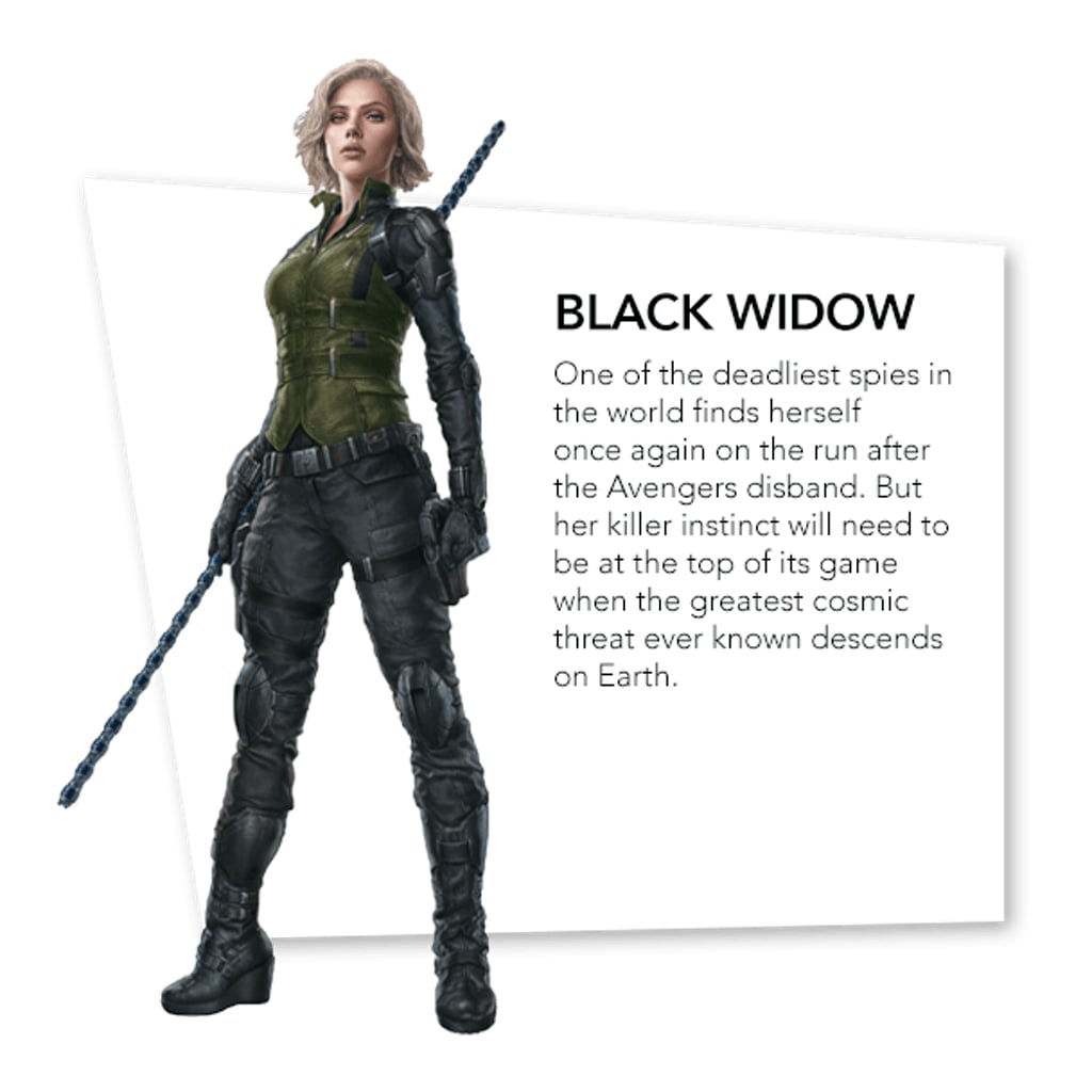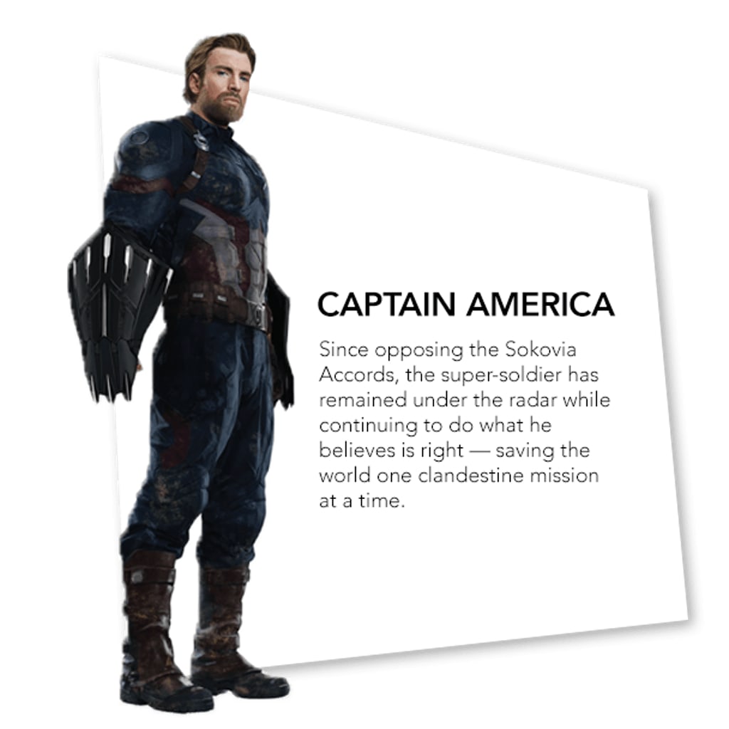 While we're missing a bunch of key players here one of the new things we learn is that Captain America hasn't been idle since giving up the shield. The bio says he's been running "clandestine missions" so despite no longer being Captain America Steve Rogers is still out there trying to help people. We learn that Black Widow has been on the run since the events of Captain America: Civil War, it's implied in the movie but we don't hear anyone actually say it, and that Thor is wrestling to feel worthy after the events of Thor: Ragnarok. The promo material for Avengers: Infinity War concerning Thor is strange; half the time he's missing an eye and the other half he's not.