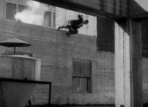 Incredibly, despite being in the body of a sedate college professor who was recently run over by a car, Cannon returns to top criminal form quickly. In the scene shown here, Cannon leaps over the side of a building and hits the ground running, with police in hot pursuit.
