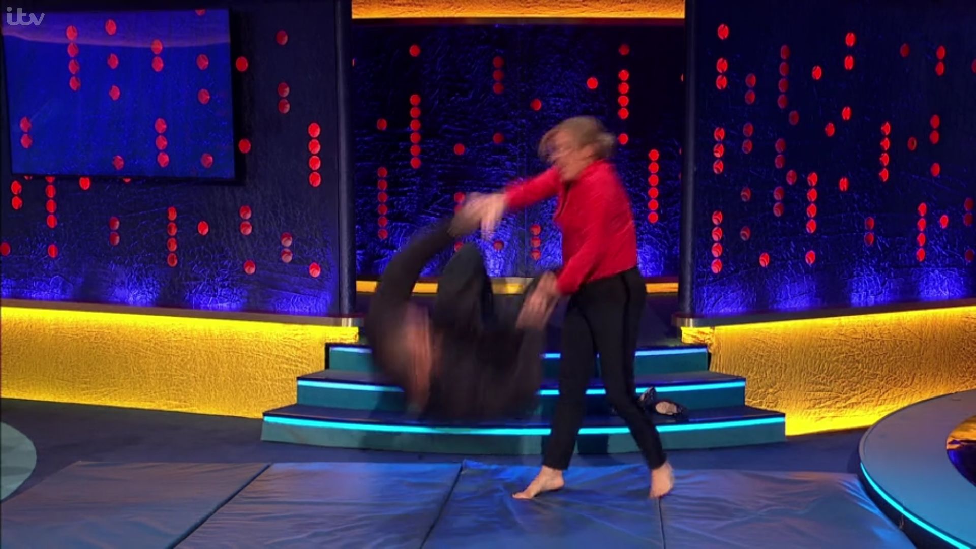 He then got to be knocked down to the floor by British Bake Off's Mel Giodroyc, who also ripped his shirt in the process. It was that kind of show…