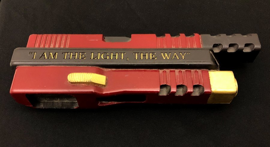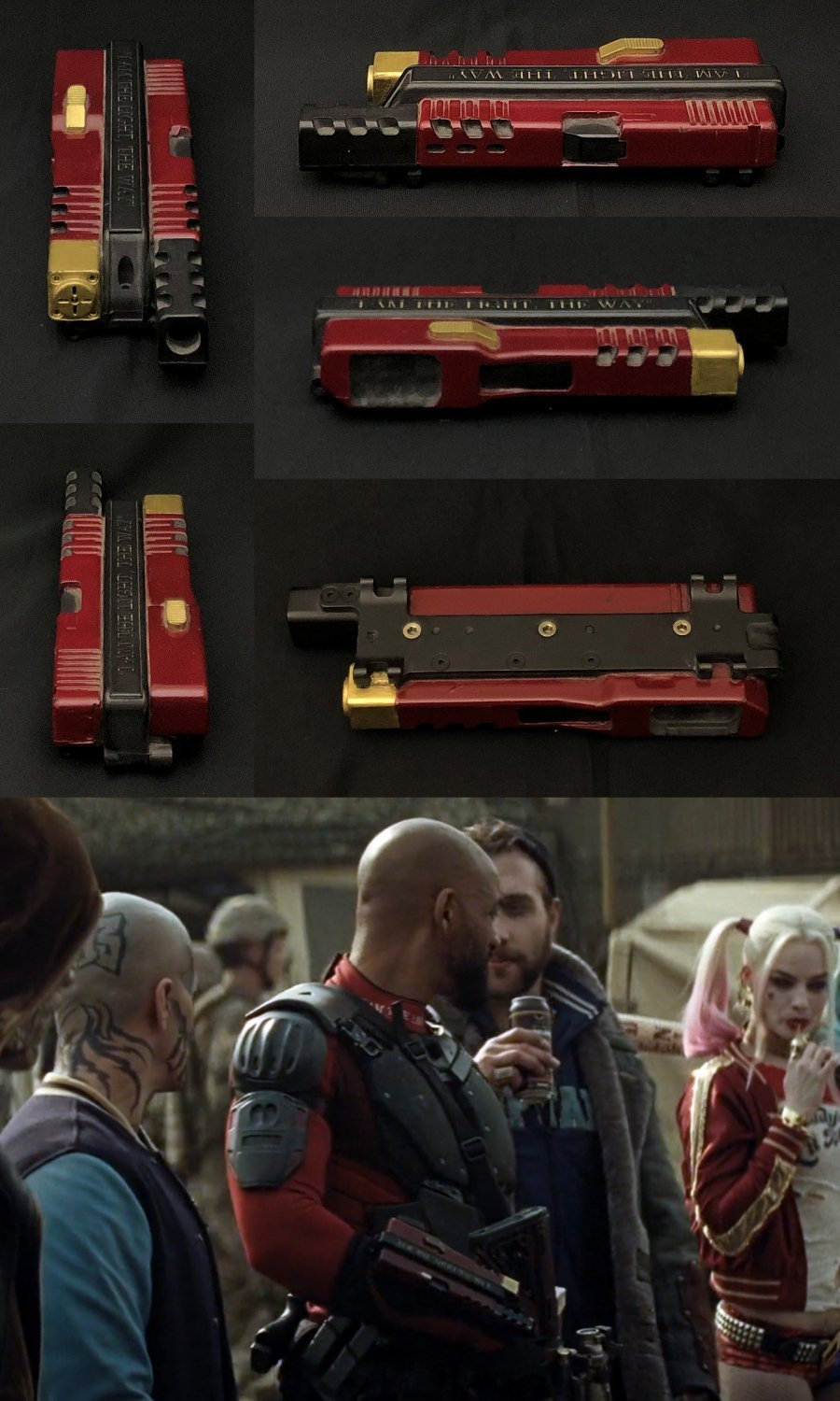 Straight from the forearm of the man that never misses , Deadshot's wrist-mounted gauntlet gun is as lethal as it is cool. There were hero versions of this gauntlet gun that were blank-firing wrist guns built from fully-automatic Glock 19 pistols, fired via a thumb trigger connected to a system involving air tubes, a pneumatic actuator, and regulated CO2 canisters hidden in the holstered Glock 18s on Will Smith's back. This gauntlet gun, however, was one used when live firing was not required on set. A well-detailed piece, in very good production-used condition.