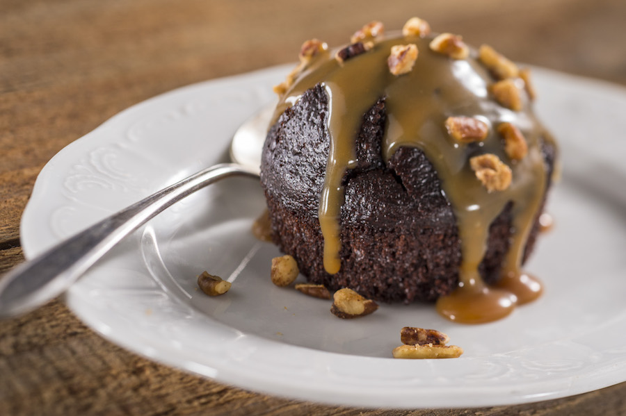 - Warm Chocolate Cake with Bourbon-salted Caramel Sauce and Spiced Pecans