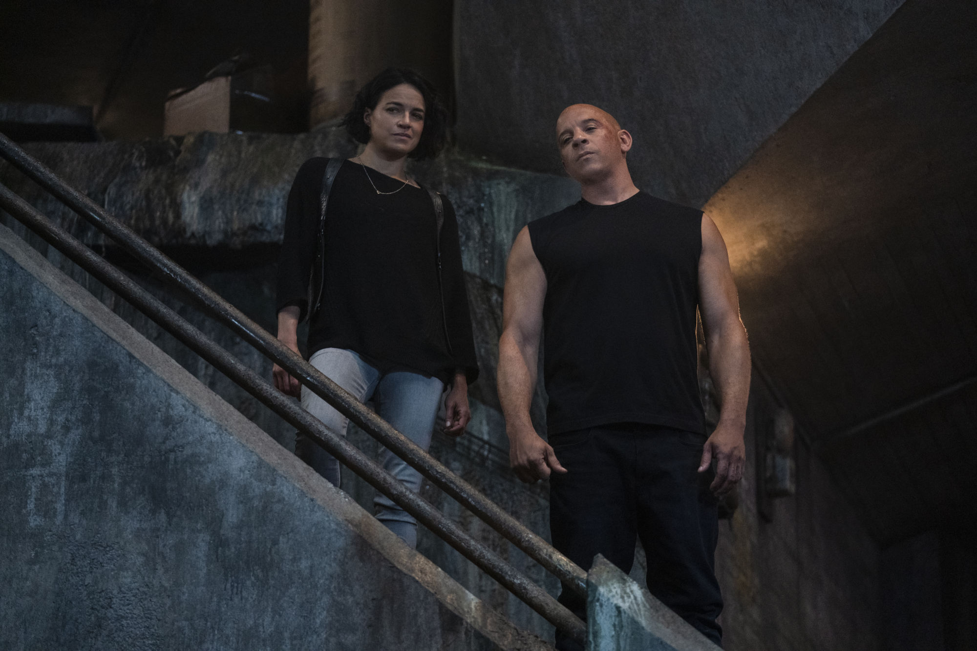- (from left) Letty (Michelle Rodriguez) and Dom (Vin Diesel) in F9, directed by Justin Lin.Credit: Universal Pictures