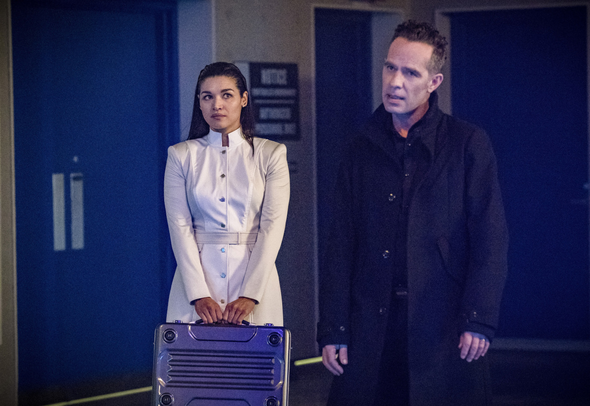 Meanwhile, Cisco (Carlos Ramon) appears to be ducking the offer Breacher (Danny Trejo) has made for him to take over as a breacher, including message cubes from Gypsy (Jessica Comacho) just checking in on him. He happily goes to the Speed Lab where he and Harry (Tom Cavanagh) try to help Caitlin (Danielle Panabaker) try to kickstart her Killer Frost powers. Barry (Grant Gustin) and Iris (Candice Patton) are there as well and notice Harry forgetting things like there being no dark matter in Caitlin anymore. When called on it, he admits to what he did and how he is losing his intelligence. The team is called to investigate DeVoe's break-in and get a hold of the gun. Cisco is hesitant to try to vibe it, as DeVoe always has traps, and would need to double his power to do it… so Barry suggest calling in Gypsy. When she arrives, you can tell the tension that is between the two, but they try to vibe the gun and get a location. When they get there to keep DeVoe from getting what is in crate 16, the find he is already there and getting what was in crate 18 instead. DeVoe uses a portal to send Barry to the North Pole and then easily takes out Vibe and Gypsy. He leaves and they two lovers argue over whose not clear headed and the breacher job comes up just as the Flash returns.
