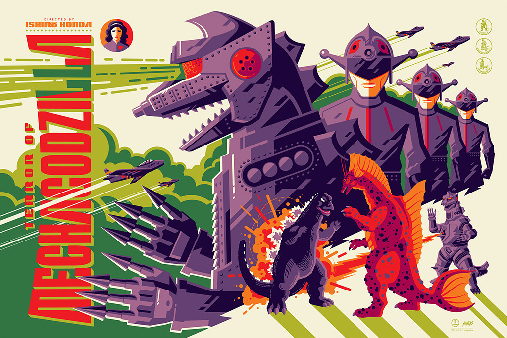 - TERROR OF MECHAGODZILLA (Variant) by Tom Whalen. 36" x 24" Screenprinted Poster. Hand numbered. Edition of 125. Printed by DL Screenprinting. Expected to Ship in May 2020. Ships to Addresses in the US & Canada Only. $75
