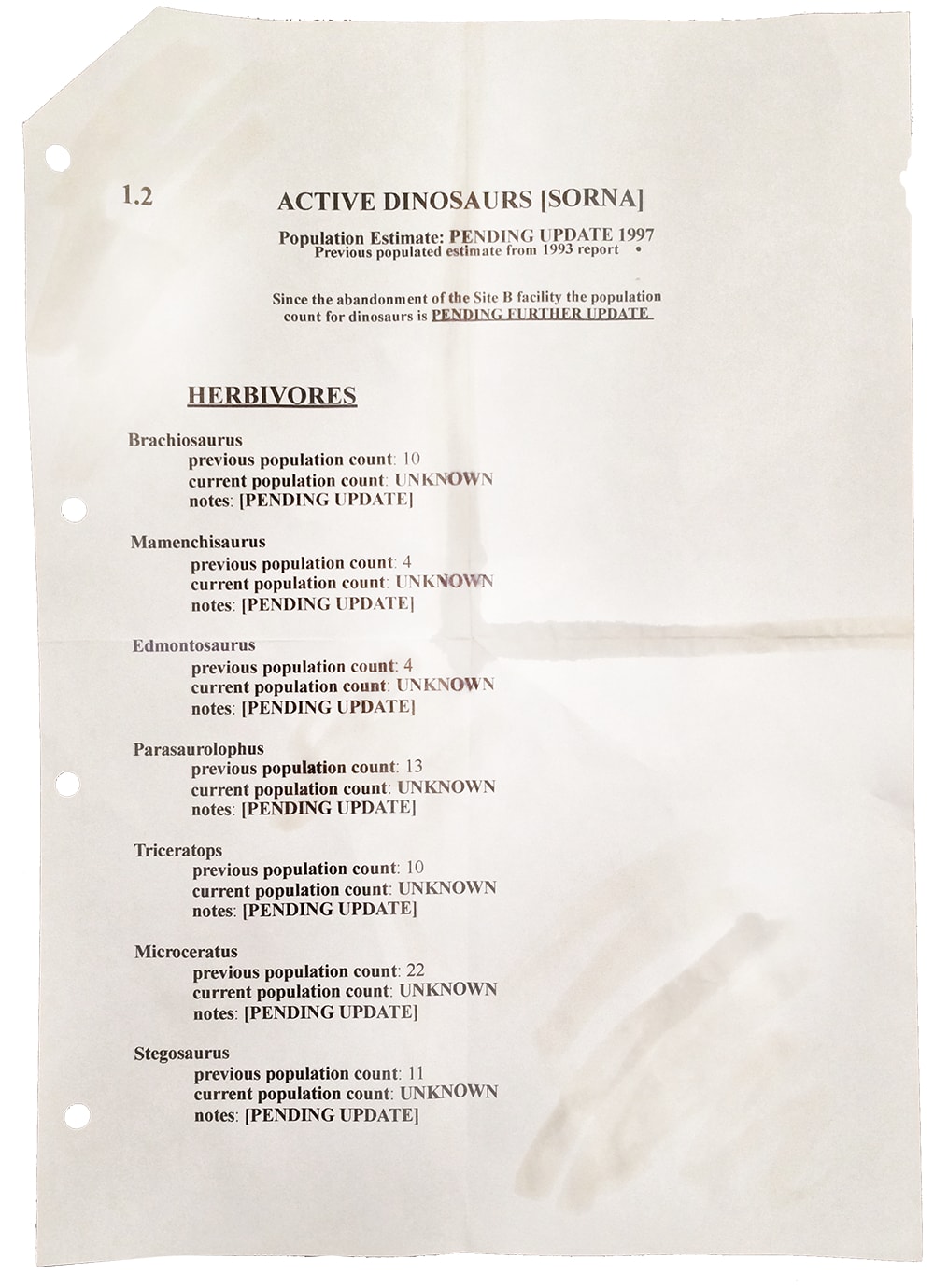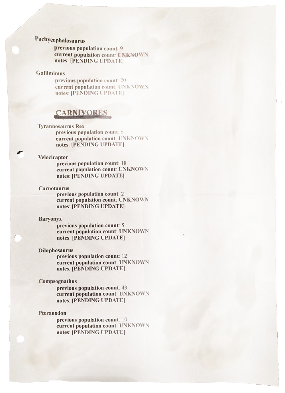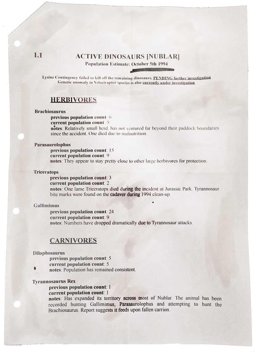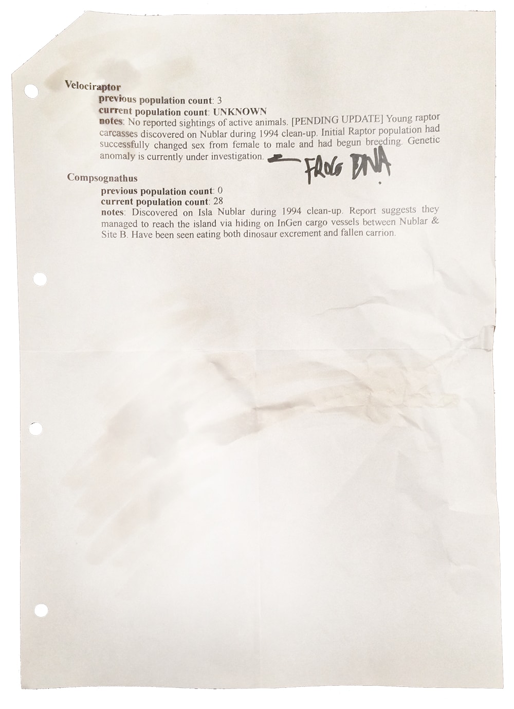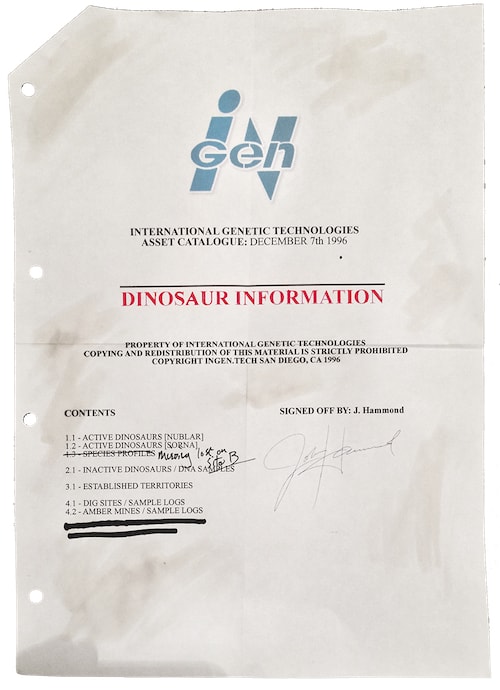The blog post continues to say that the company basically bought politicians to get permission to loosen the laws so they could clone and breed new species under the guise of avoiding genetic missteps that happen in every species of animal. There are a bunch of "leaked InGen" documents that include some fun teasers from the previous movies.