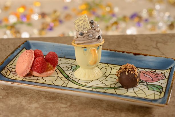 - Dessert Trio–Raspberry Macaron, maraschino cherry dipped in dark chocolate, white chocolate Chip cup with The Grey Stuff at Be Our Guest