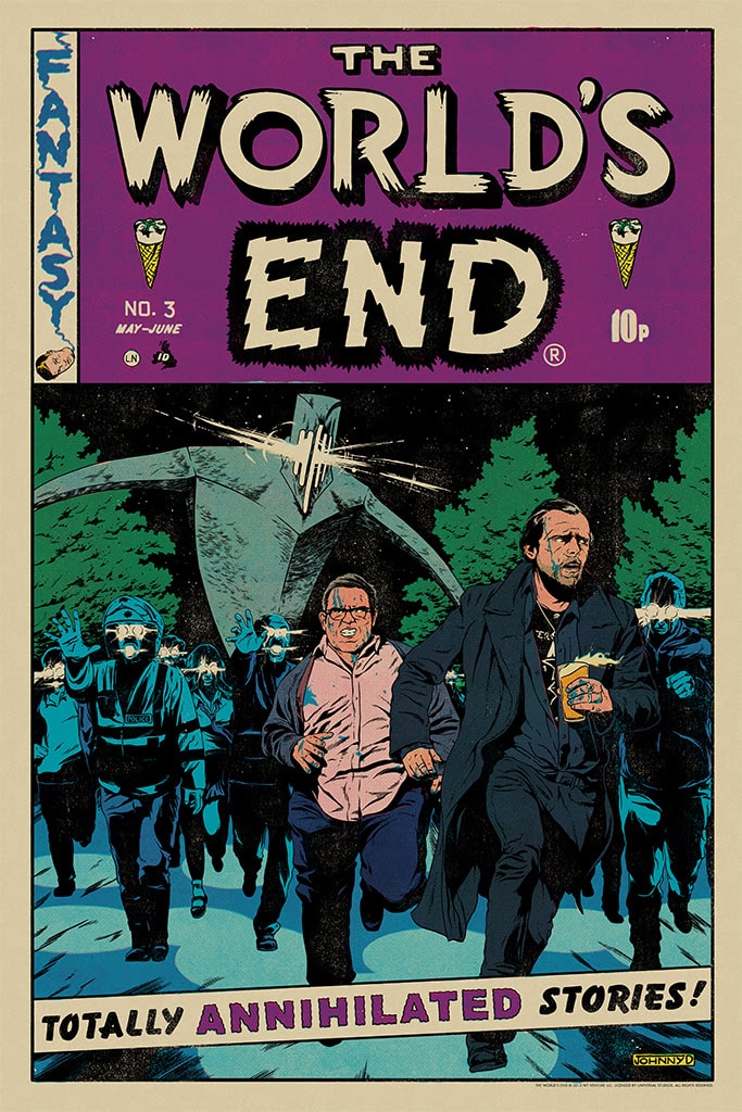 Today we have an excellent set of posters based on Edgar Wright's Cornetto Trilogy by Johnny Dombrowski! We're continually blown away by Johnny's illustrative prowess and his note-perfect interpretations of modern films as classic comic book covers. As iconic genre staples, SHAUN OF THE DEAD (horror), HOT FUZZ (crime), and THE WORLD'S END (fantasy) lend themselves beautifully to EC-inspired comic cover treatment.