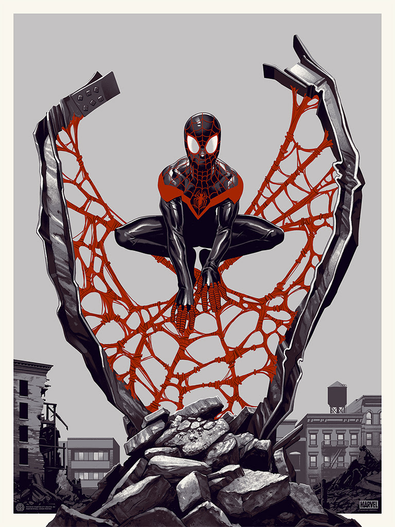 - SPIDER-MAN: MILES MORALES (Variant) by Phantom City Creative. 18"x24" screenprinted poster. Hand numbered. Edition of 125. Printed by Lady Lazarus Press. Expected to Ship in February 2019. Ships to Addresses in US Only. $60