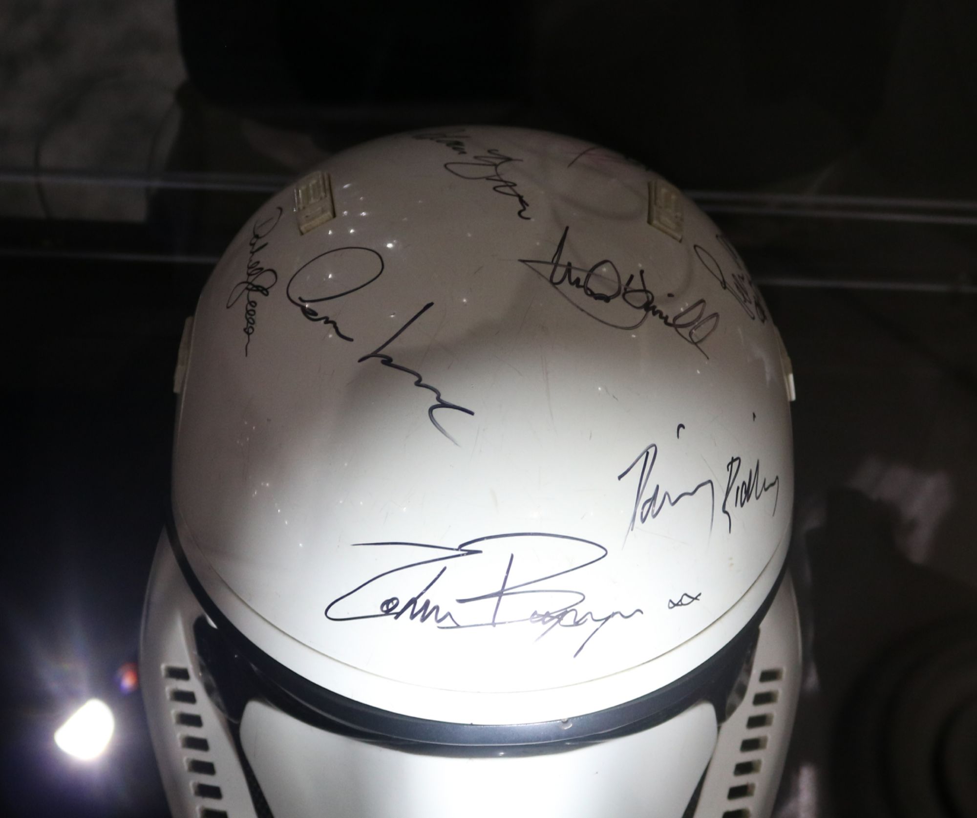 We'll start by taking a look at a few of Brian's favorites, beginning with a beautiful The Force Awakens stormtrooper helmet, and it comes certified by George Lucas. The helmet was screen used, as evidenced by the dings and cracks from the production, and also happens to be signed by Lucas, Mark Hamill, Carrie Fisher, and Harrison Ford, and many more.