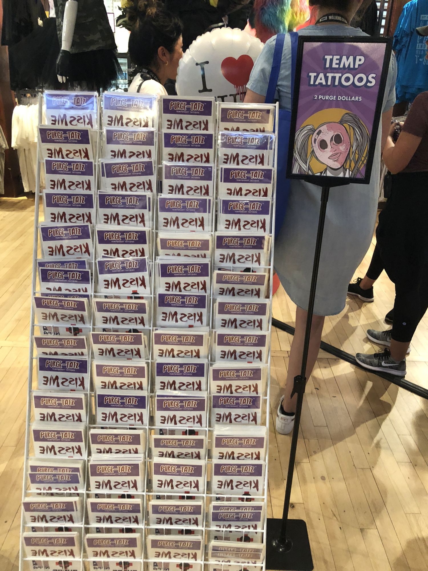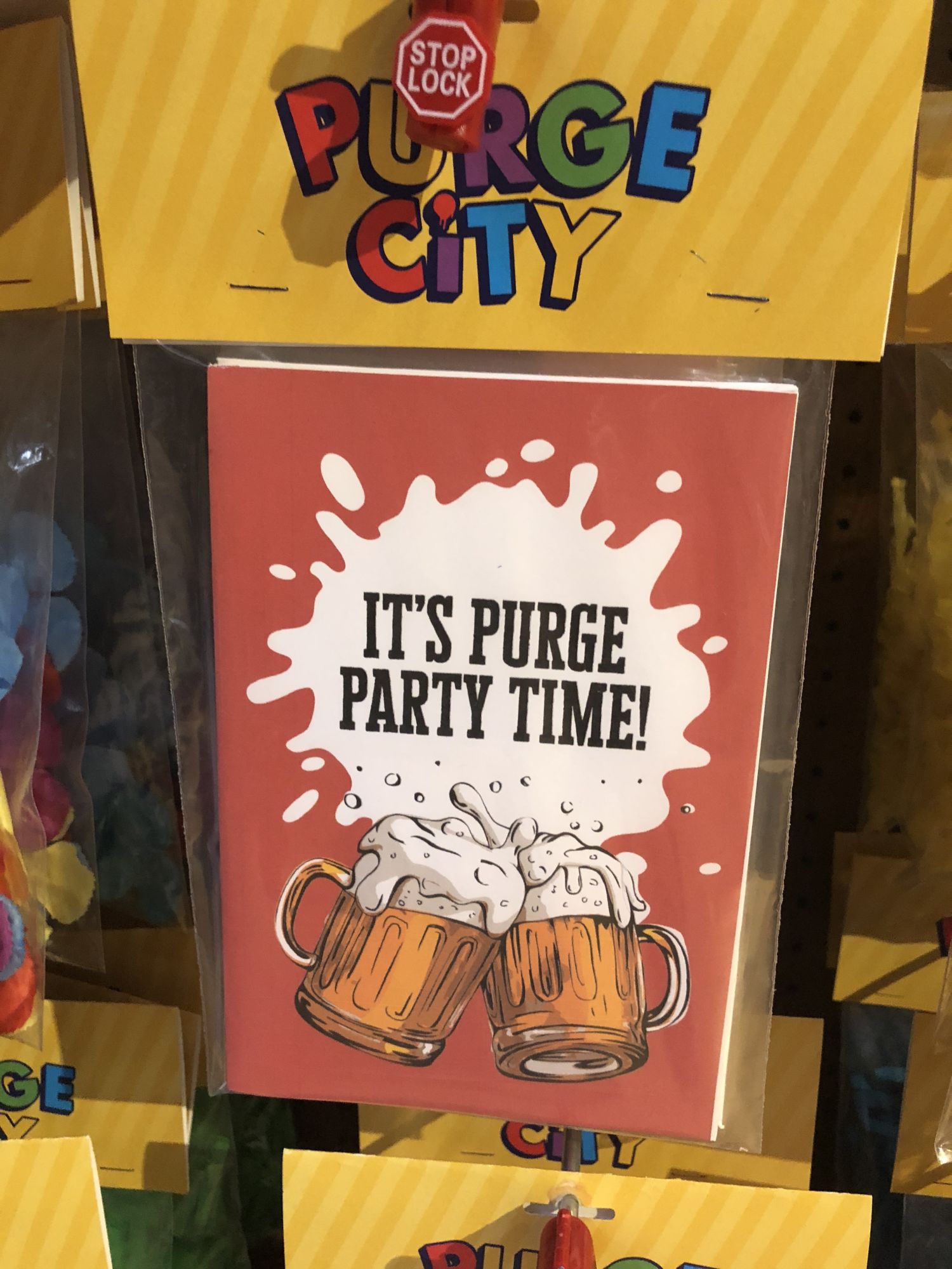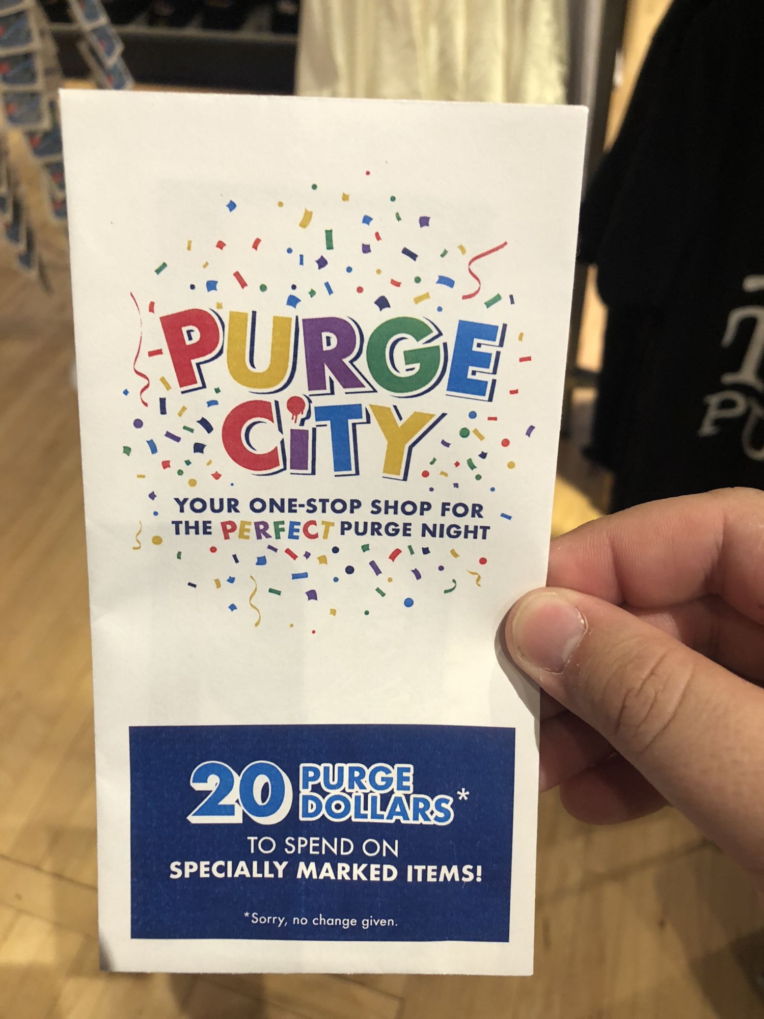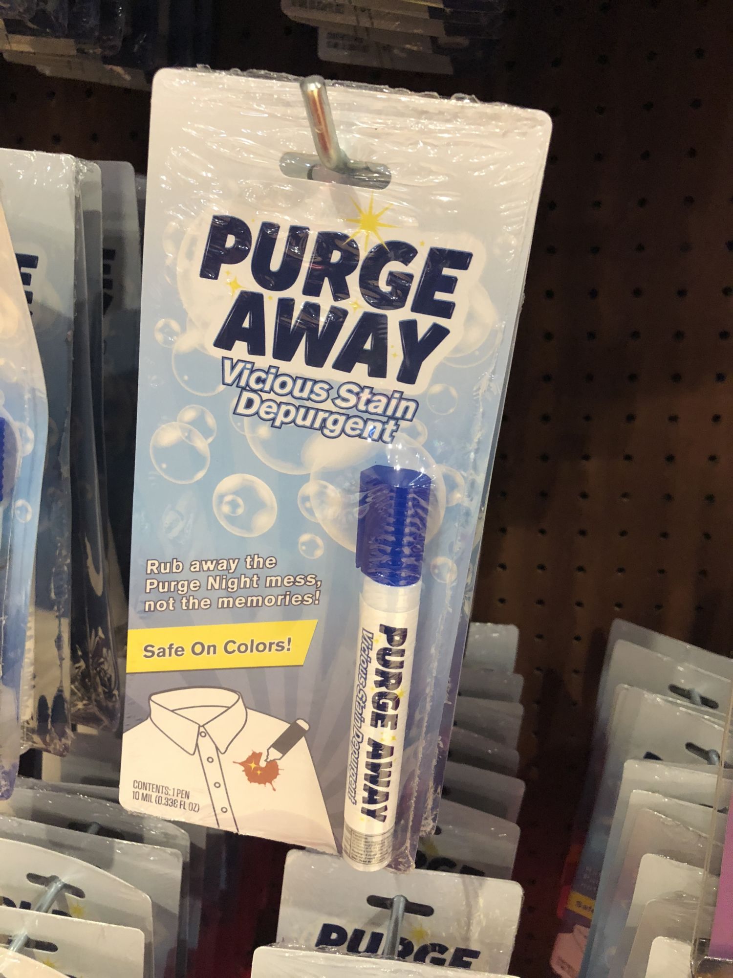 After being greeted by the friendly staff, you were handed 20 Purge dollars, good on anything in the store labeled for sale. And there was so much stuff! Shirts, hats, barb wire, greeting cards, energy drinks, buttons. My personal favorite was Purge Away. What is that you ask? Here is a video demonstration that will answer that very question!