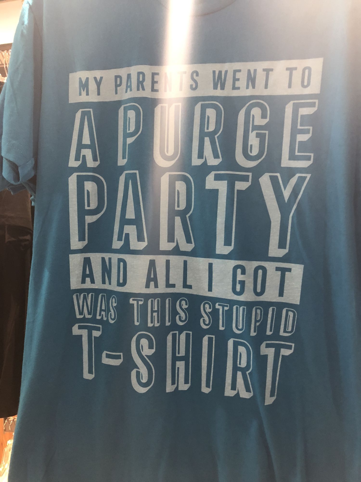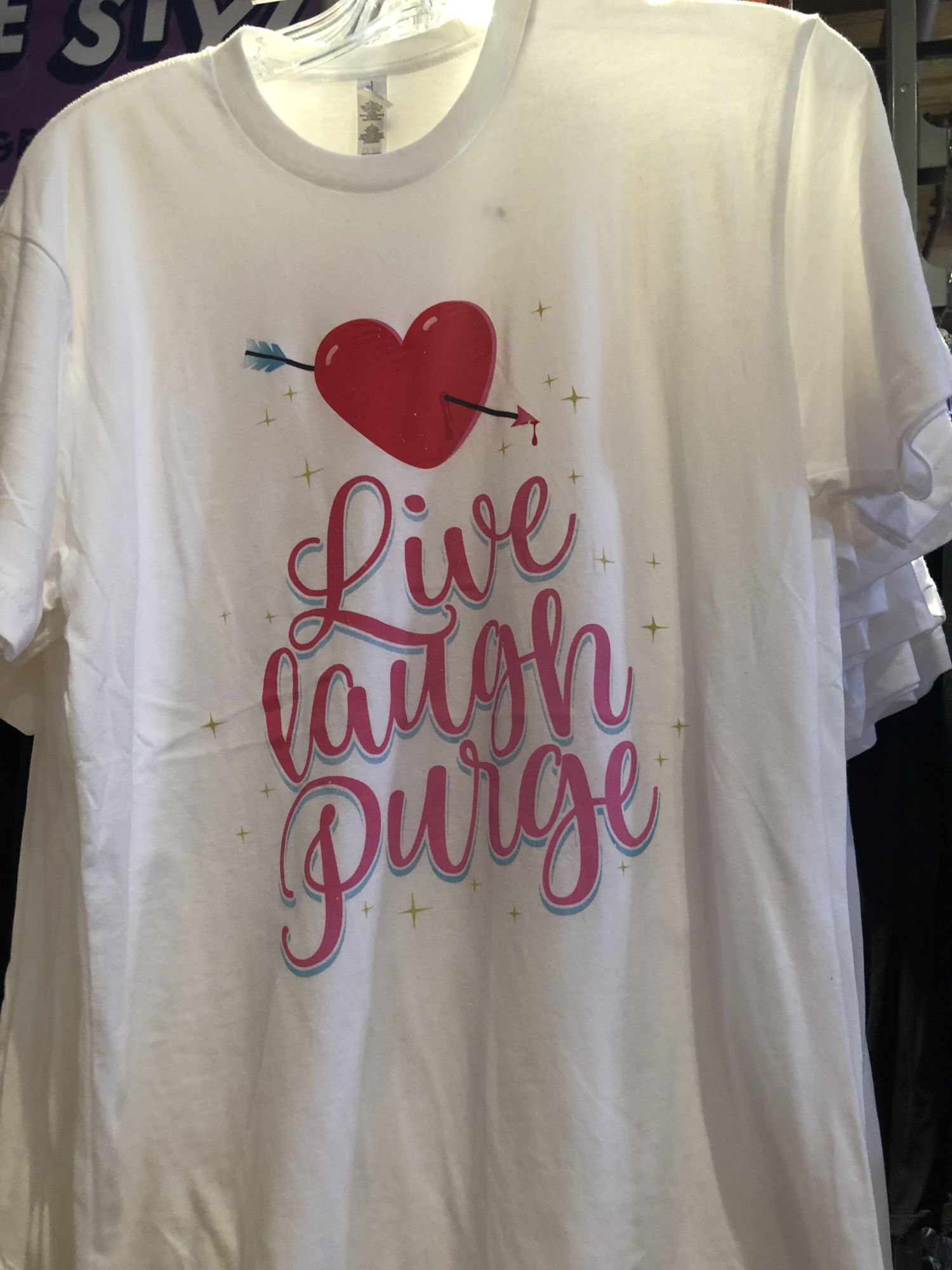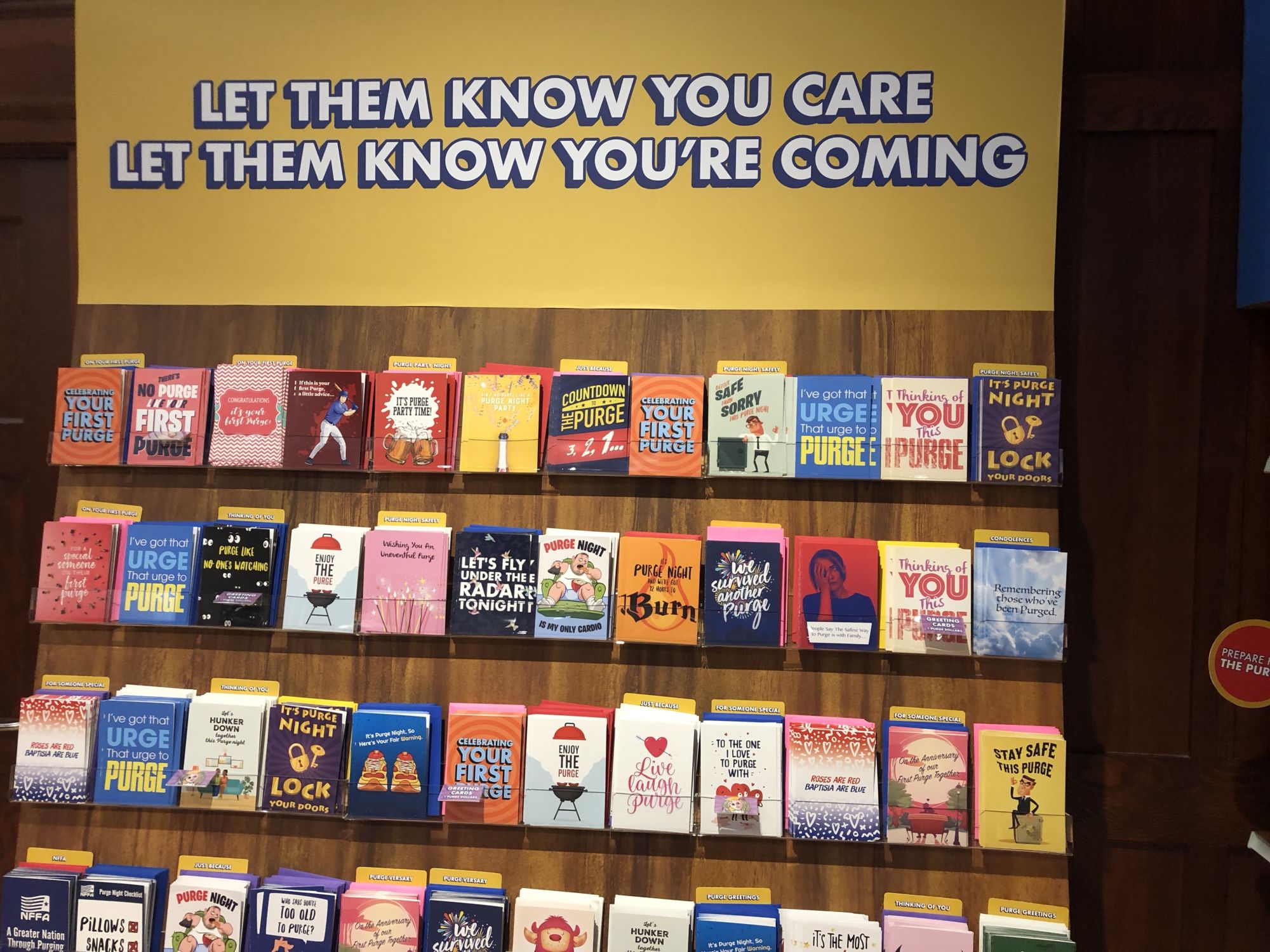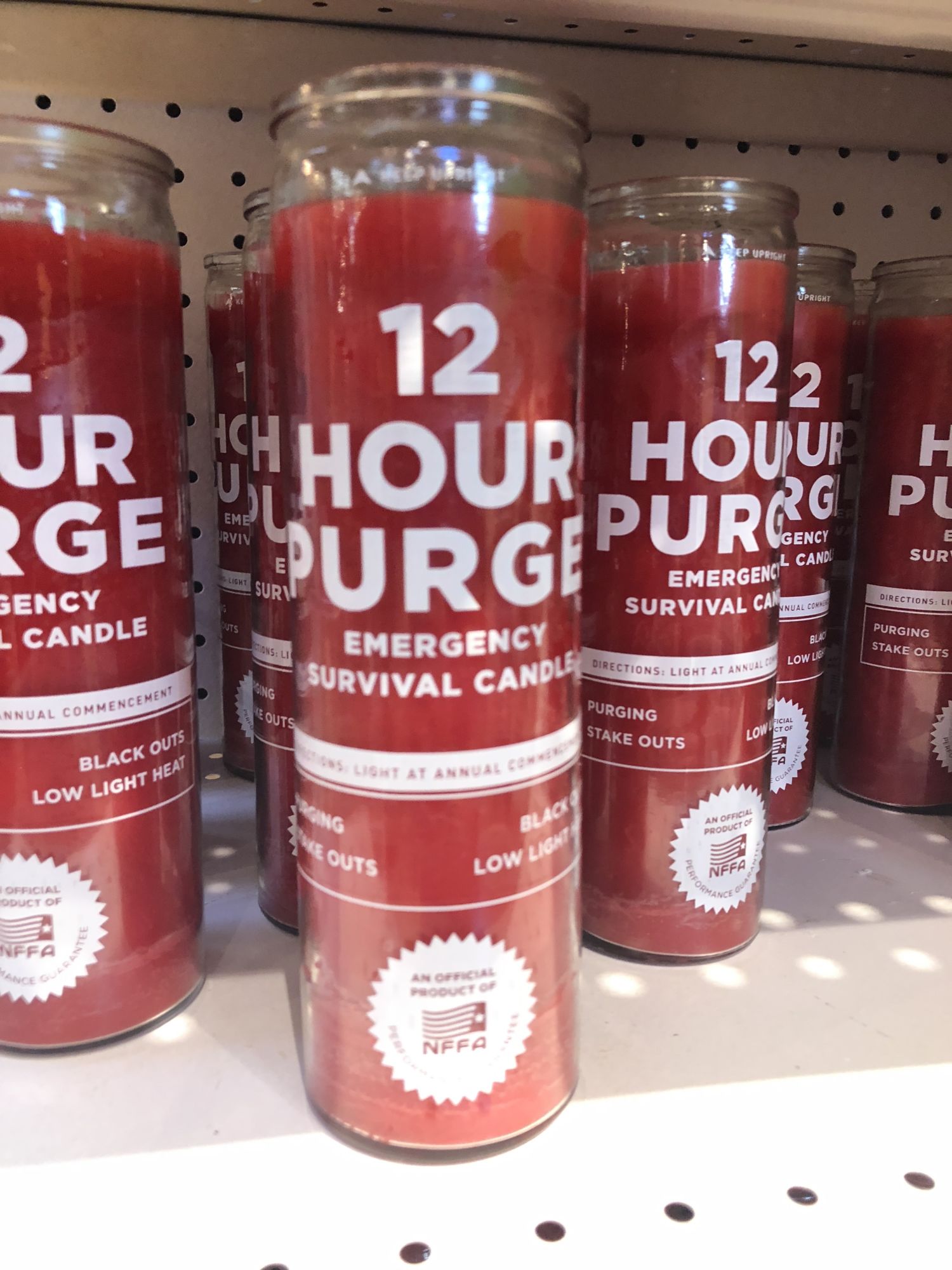 After being greeted by the friendly staff, you were handed 20 Purge dollars, good on anything in the store labeled for sale. And there was so much stuff! Shirts, hats, barb wire, greeting cards, energy drinks, buttons. My personal favorite was Purge Away. What is that you ask? Here is a video demonstration that will answer that very question!