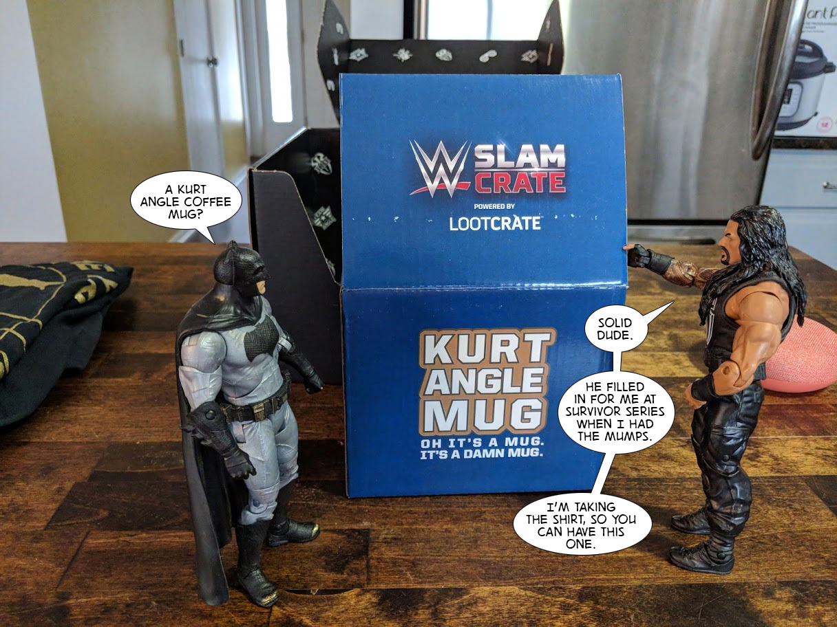 Unfortunately, Batman and Roman stopped unboxing Comic Bentos after that, but starting this month, the pair have begun a new subscription to WWE Slam Crate, the subscription box for the WWE Universe from Loot Crate! For $34.99 per bi-monthly box (less if you subscribe for 3 or 6 boxes at a time), 4-6 pieces of WWE merchandise will arrive at your doorstep in a neat little box. This box was sent to Batman and Roman for free in exchange for an unbiased (to the extent Roman is capable, given the circumstances) review.
