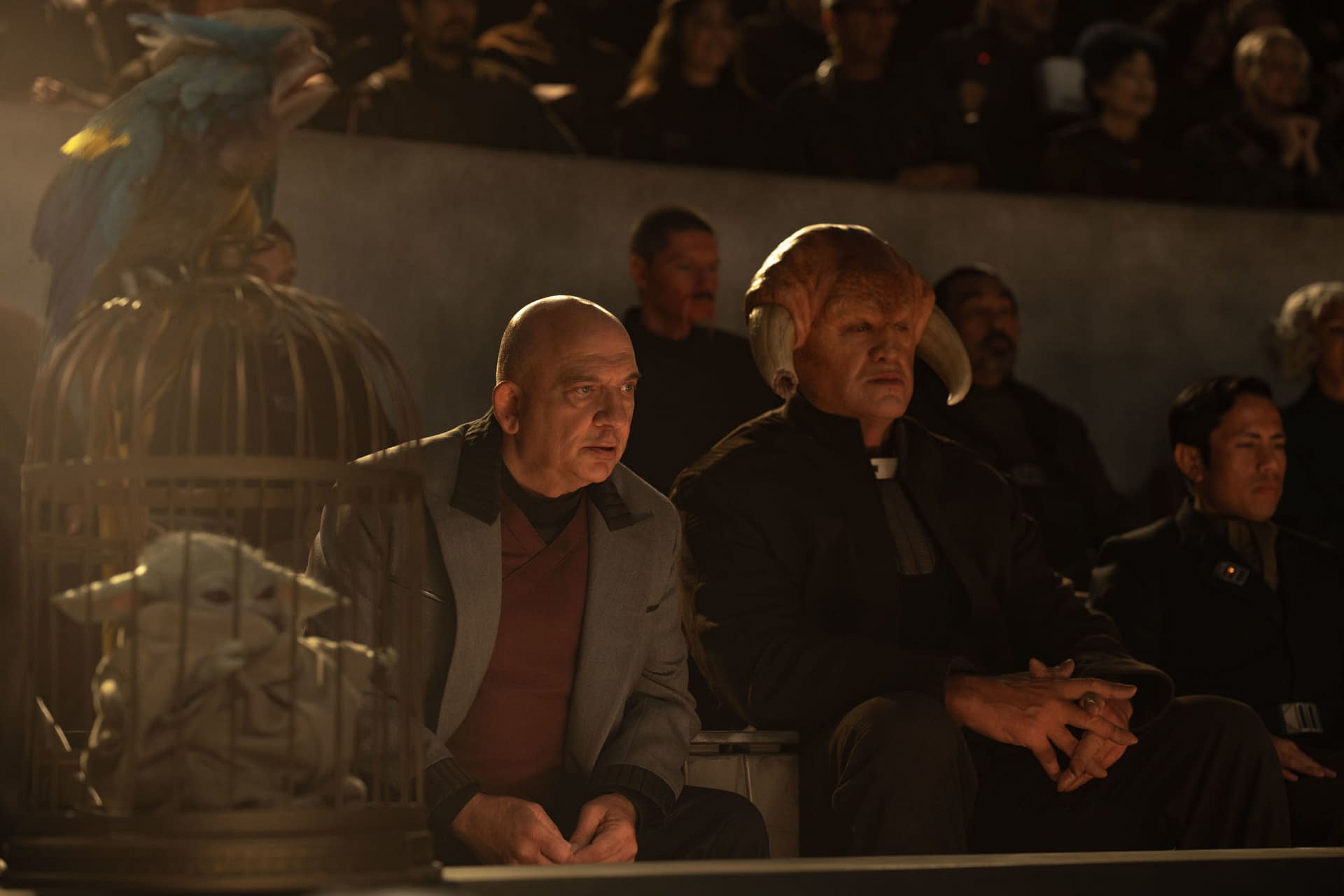 - (L-R) Lord Janu (Jonny Coyne) and Hogsbreth (Matthew Willig) in Lucasfilm's THE MANDALORIAN AND GROGU. Photo by Francois Duhamel.. © 2026 Lucasfilm Ltd™. All Rights Reserved. Photo by Francois Duhamel / Lucasfilm Ltd