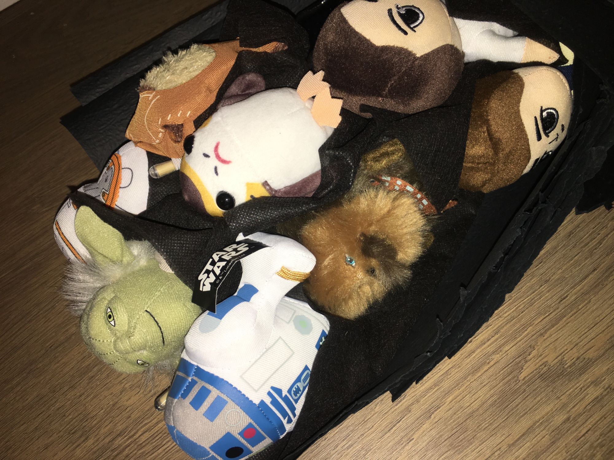 The packaging is attractive, showing the three new heroes in the Star Wars saga on the side and back. You get nine mini plushies, which include: