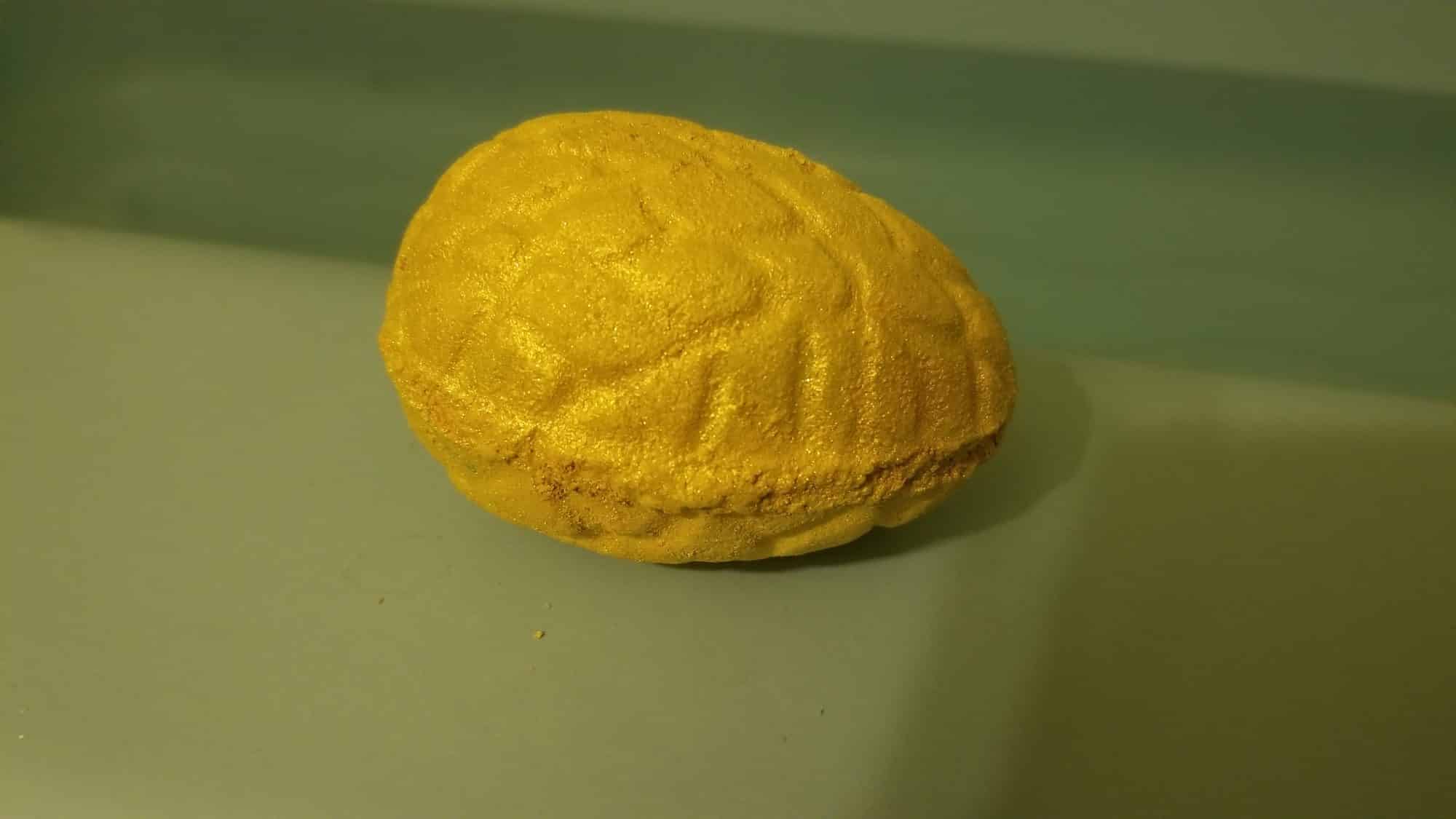 The Golden Dragon egg was a bomb I was hesitant to use. It was very glittery and I was worried both I and my tub would be covered in glitter and there are few things harder to get rid of than glitter. It was also the most fragile of all the bath bombs and I was worried I was going to break it when I took it out of the packaging. This is a very glittery bath bomb that turned my water a pale gold. The water shimmered and it was quite pretty to look at. This one is for fans of blood oranges and oranges in general and it was probably the most subtle of the scents. As far as glitter goes I did have some on my skin after I got out and a bit of residue left on my tub. This is one best left for a day you have time to rinse off afterward.