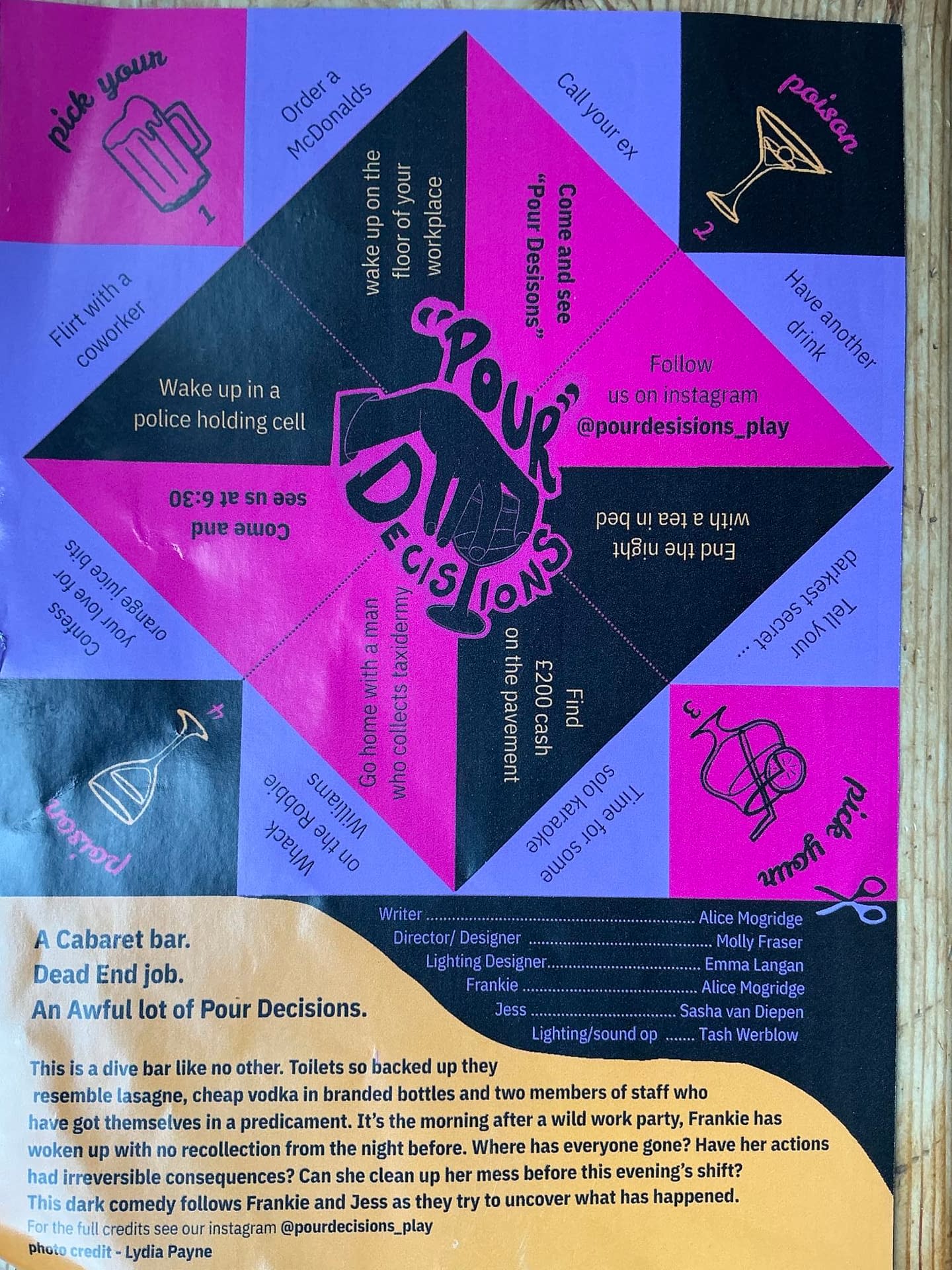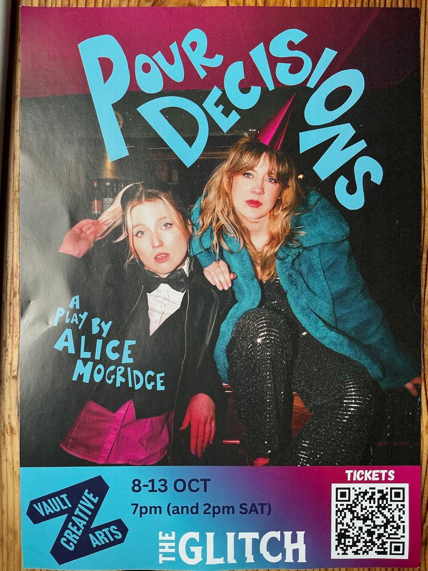 Pour Decisions, written by and starring Alice Mogridge, alongside Sasha Van Diepen, directed and designed by Molly Fraser, lighting design by Emma Langan, lighting and sound operator Tash Werblow, on at The Glitch from the 8th to the 13th of October, 2025. That's today. If you're in London tonight and can make it to the South Bank, this is your last chance. Take it. And bring someone with you. Four stars.