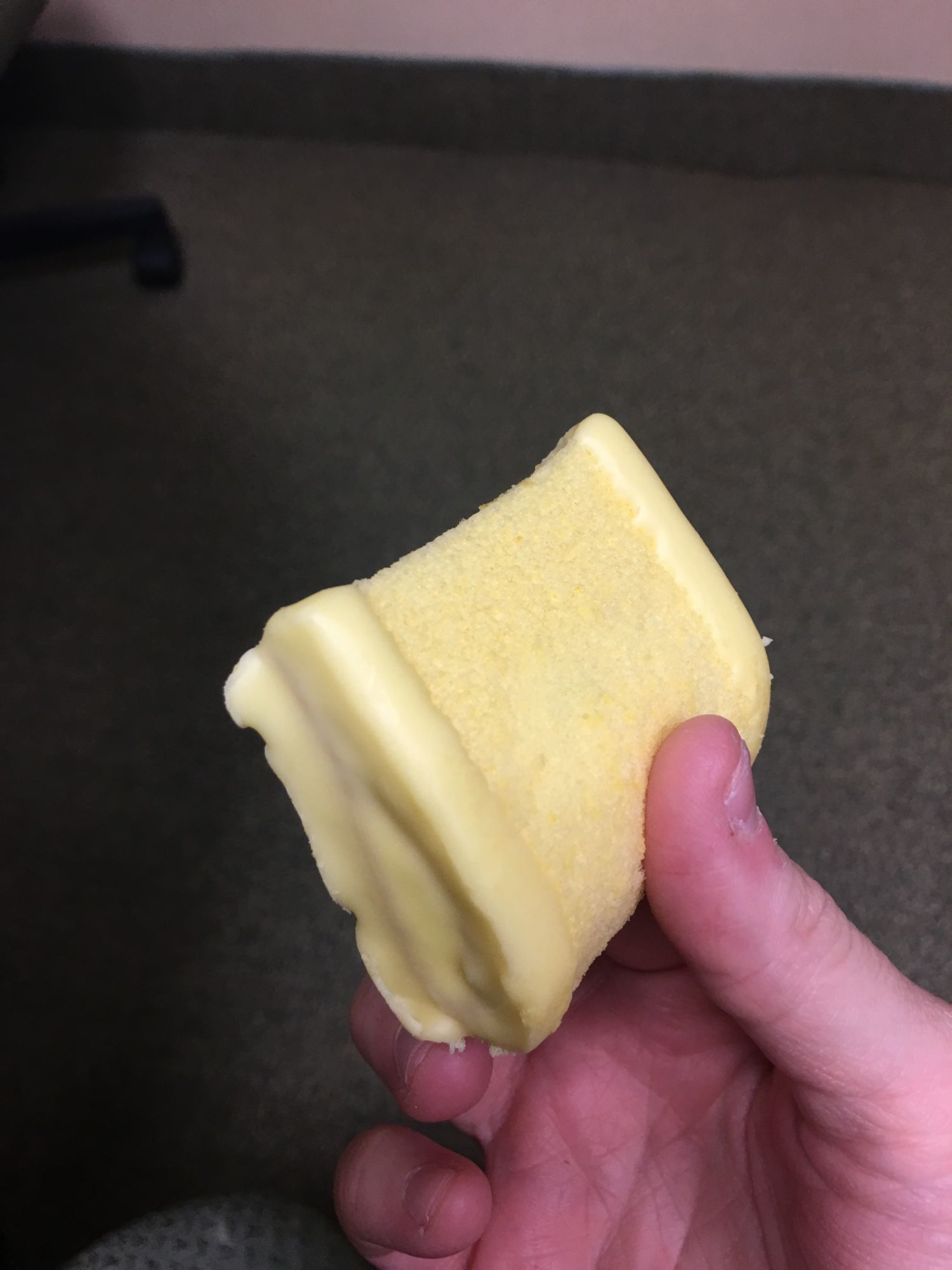 Clearly these aren't egg and banana omelettes, as one might think — they're little cakes folded over with banana cream inside! These are super soft, and they're pretty good. They have a light banana smell that isn't awful. The banana flavor was a little odd, but I'd absolutely eat these again! It was a mild flavor, which I prefer with my sweets. Plus, the packaging is fairly dainty. If you find these out in the wild, grab a box!