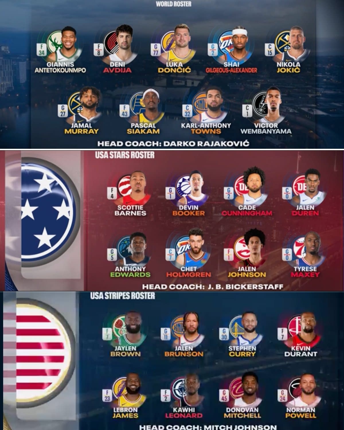 USA vs. World Rosters: There are two USA teams — Stars and Stripes — and one World team. Fans voted for five starters from each of the Western and Eastern Conferences, and the NBA coaches voted in the 14 reserve players (plus NBA Commissioner Adam Silver added one more USA player to balance the rosters, and also picked the injury replacements). The league divided up the teams. Here's a rundown of the respective rosters (along with a look at who was selected to start but is out with injuries):