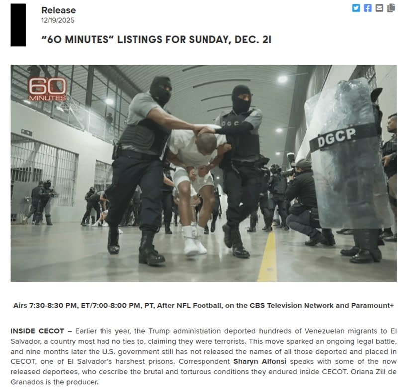 Tonight's edition of 60 Minutes and a last-minute editorial change aren't exactly easing concerns, with the long-running news magazine announcing on social media: "The broadcast lineup for tonight's edition of 60 Minutes has been updated. Our report "Inside CECOT" will air in a future broadcast." In the segment, correspondent Sharyn Alfonsi was set to speak with several Venezuelan individuals who were detained in El Salvador's CECOT (Centro de Confinamiento del Terrorismo/Terrorism Confinement Center) by the Trump Administration to discuss the brutal and torturous conditions they endured. Here's a look at the official overview for the segment that was released: