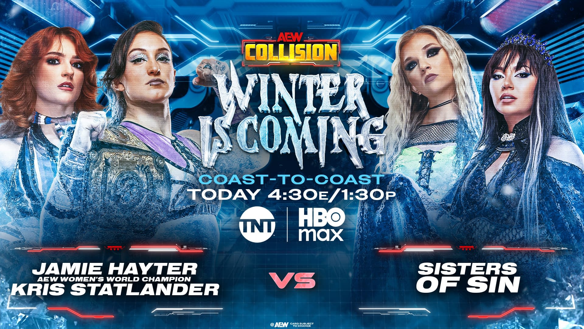 - AEW Collision: Winter is Coming airs live from Cardiff this afternoon at 4:30 p.m. ET on TNT and HBO Max.