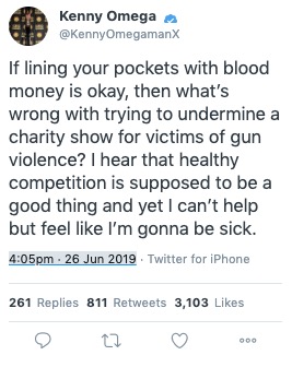 While Omega was not specific about what the original tweet was in reference to, he tweeted it shortly after WWE announced plans to stream Evolve 131 on the WWE Network opposite Fight for the Fallen on July 13th. While some proceeds from live attendance at Fight for the Fallen will be given to victims of gun violence, the event will be live-streamed for free, but it's unknown whether AEW plans to attempt to raise more money by encouraging viewers to donate to the charity during the broadcast.