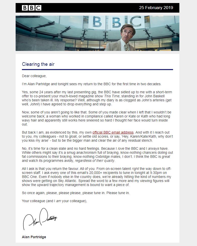 But today, he returns with a new series, a parody of BBC's The One Show magazine programme, This Time with Alan Partridge parachuted in as a host by a corporation who believe they have lost the voice and trust of Brexit Britain. And, staying in character, 'Alan Partridge' has just emailed every BBC employee urging them to watch the show. Which is just the kind of thing Alan Partridge would do. I am reminded of his claim in Knowing Me, Knowing You that there was a conspiracy to deprive him of viewers…