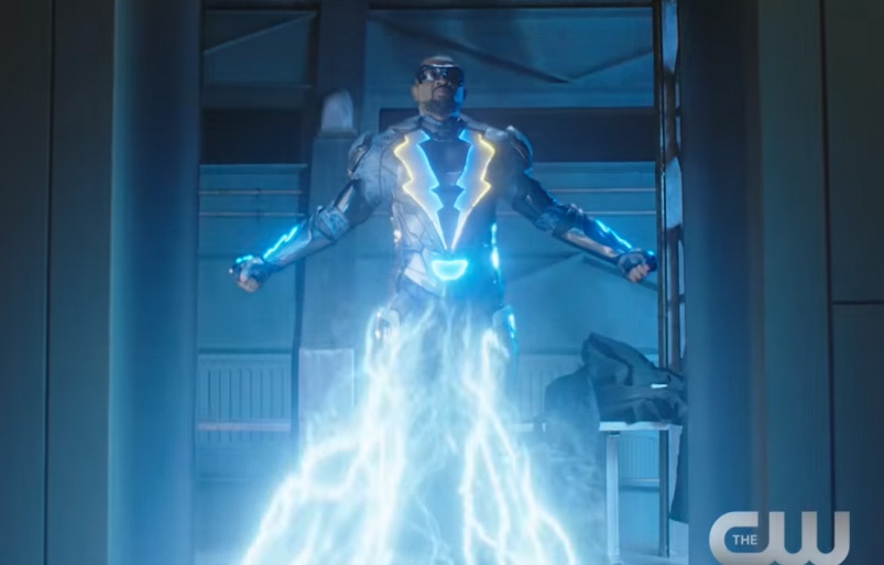 They work in another super-speed type joke with Barry (Grant Gustin), Kara (Melissa Benoist), and Oliver (Stephen Amell). They're area also more lines for Cisco (Carlos Valdes), Rene (Rick Gonzalez), Ray (Brandon Routh), and Sara (Caity Lotz). But the big reveal is after everyone heads out — there is a side door we look in and see Jefferson (Cress William) charging up to get ready. My guess is this was done because Black Lightning films in Atlanta while the rest of the Arrowverse is in Vancouver.