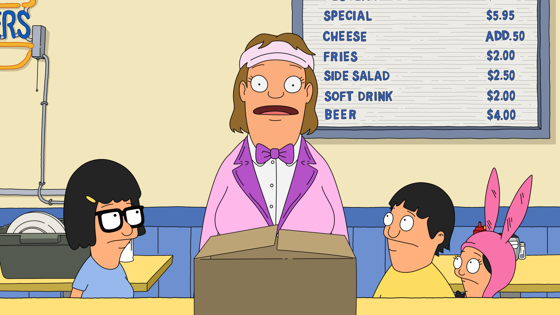 The competitions featured in the limo relay were awesome and made unique use of Bob and the kids. The Bob's Burgers writers did them justice with each thing they had to accomplish when helping Nat in the competition. Gene and Louise had some amazing old lady cosplay going on and lived out their extroverted dreams. Bob got into character and used his restaurant expertise to hold up the coffee and briefcase. The one that got to me was Tina'srole as someone going to prom and the eventual speech Bob made to her towards the end of this episode.