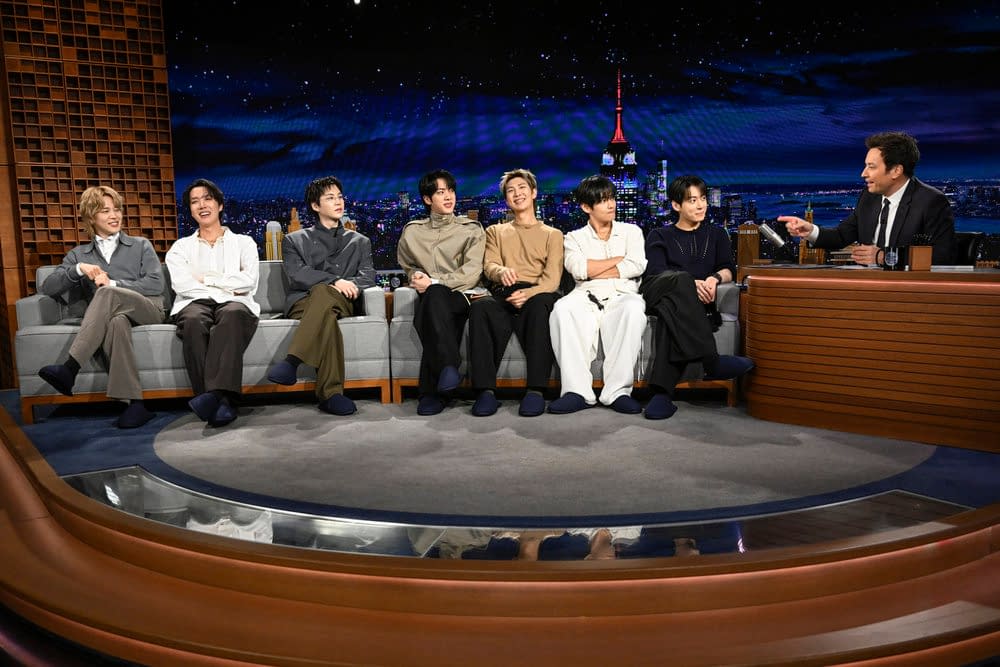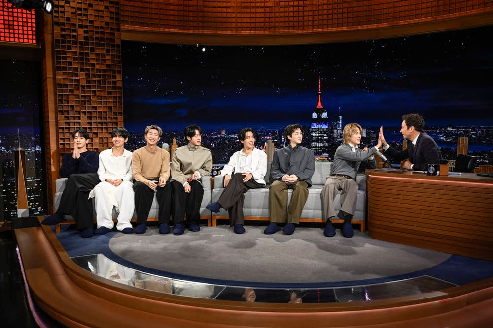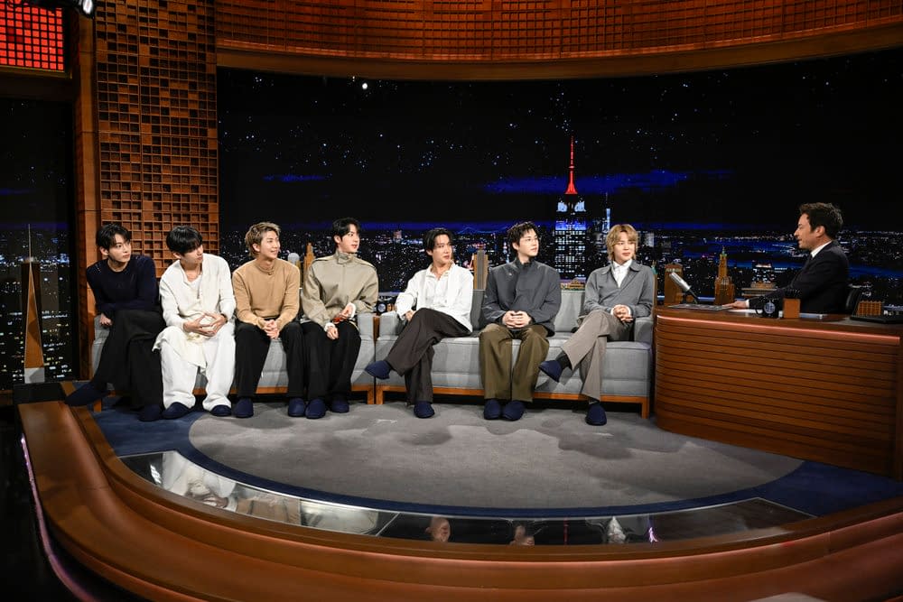Along with the official image gallery that was released from the group's late-night visit, we've got BTS discussing their return album and upcoming tour, what it was like being apart for so long, being off the K-pop scene, and reuniting as a group. In addition, BTS and Fallon listen to tracks "SWIM," "2.0," and "NORMAL," with the group offering insights into the inspirations behind each one. Then, Fallon hits the group with a series of fan questions, ranging from songs they would recommend to new fans to the truth about RM's driving skills to a deep dive into Jin's butt theory. Finally, Fallon and the group have a little fun at some fans' expense – but they really don't seem to mind…