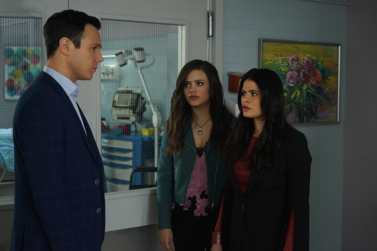 - Charmed — "Red Rain" — Image Number: CMD121b_0013.jpg — Pictured (L-R): Rupert Evans as Harry, Sarah Jeffery as Maggie and Melonie Diaz as Mel — Photo: Shane Harvey/The CW — é 2019 The CW Network, LLC. All rights reserved.