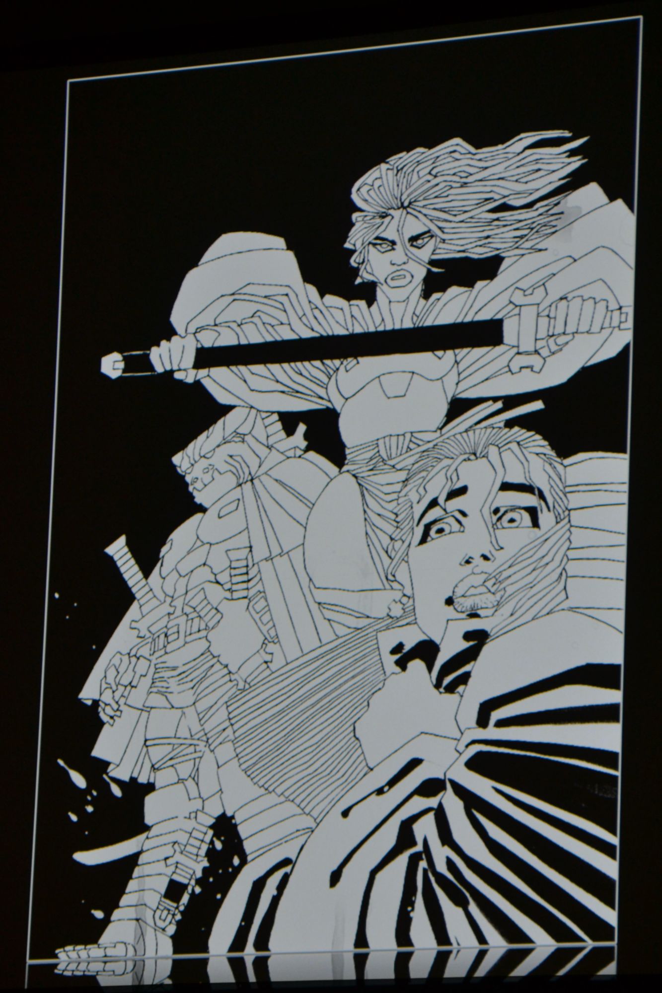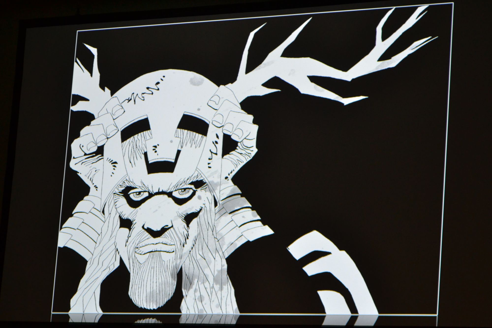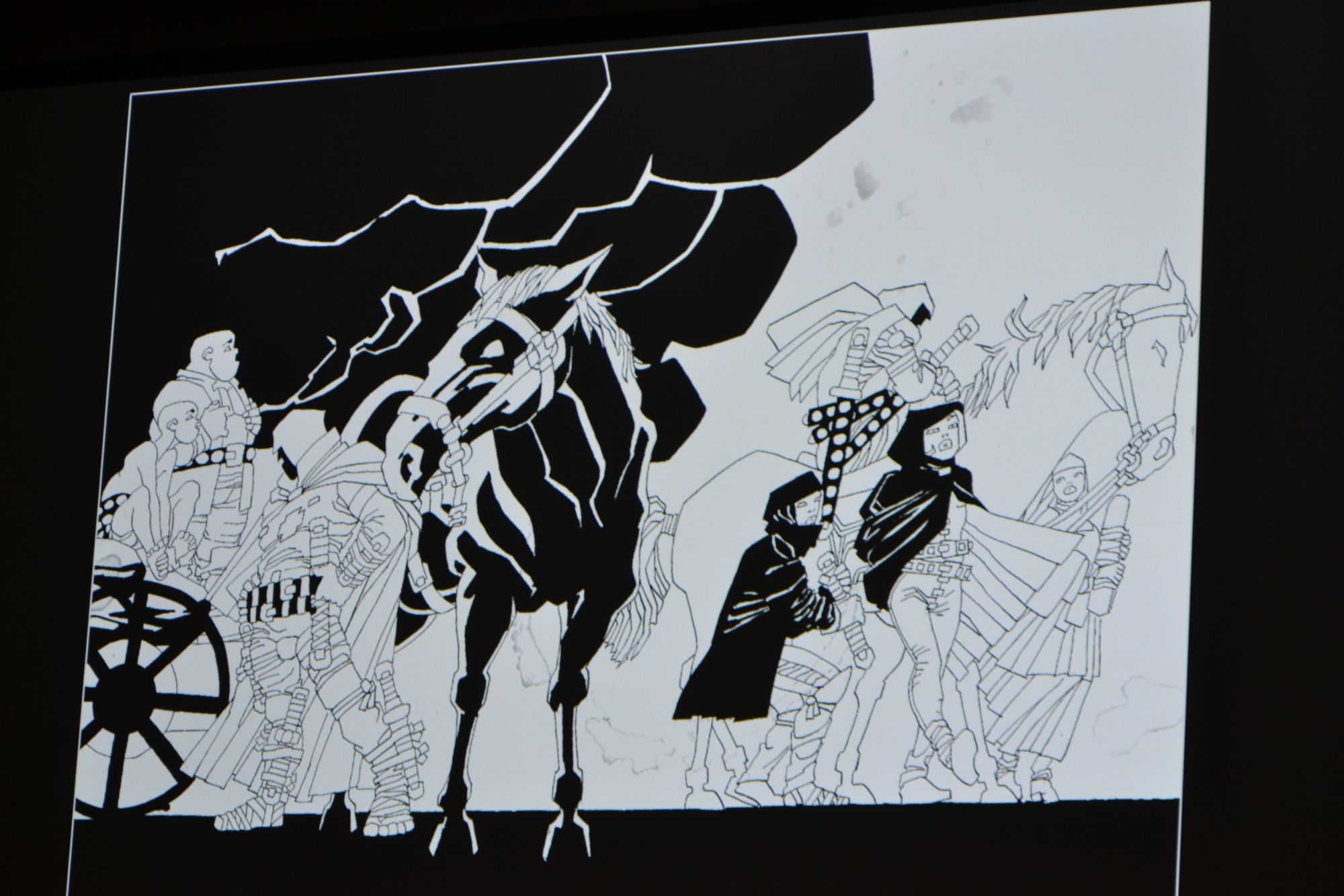 According to the panel, the show's visual style is strongly based on Miller's art for the book – with many of Miller's book illustrations on display for the SDCC audience. Mostly in black and white, the art has a geometric aspect – brutal with its hard edges and stark contrasts between dark and light. The few colored pieces that were shown feel like animated stills. The colors are bright, and the characters are in action, fighting, hiding, or speaking. Miller's dark artistic style is evident throughout. During the panel, Miller and Fuentes pointed out that despite the young adult audience, they wanted to focus on the hard, dark realities of the Middle Ages.