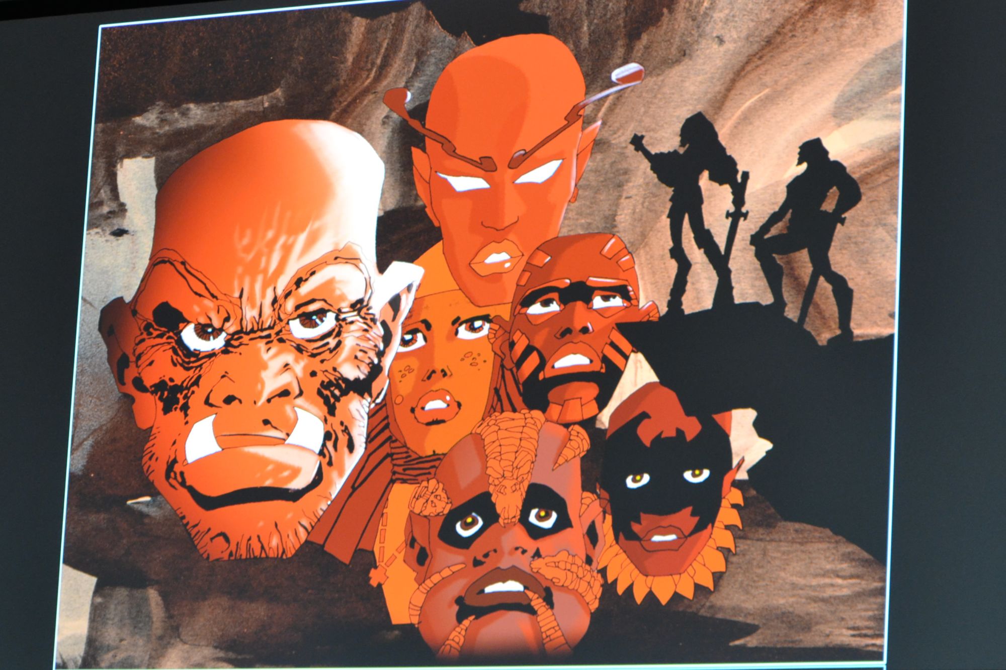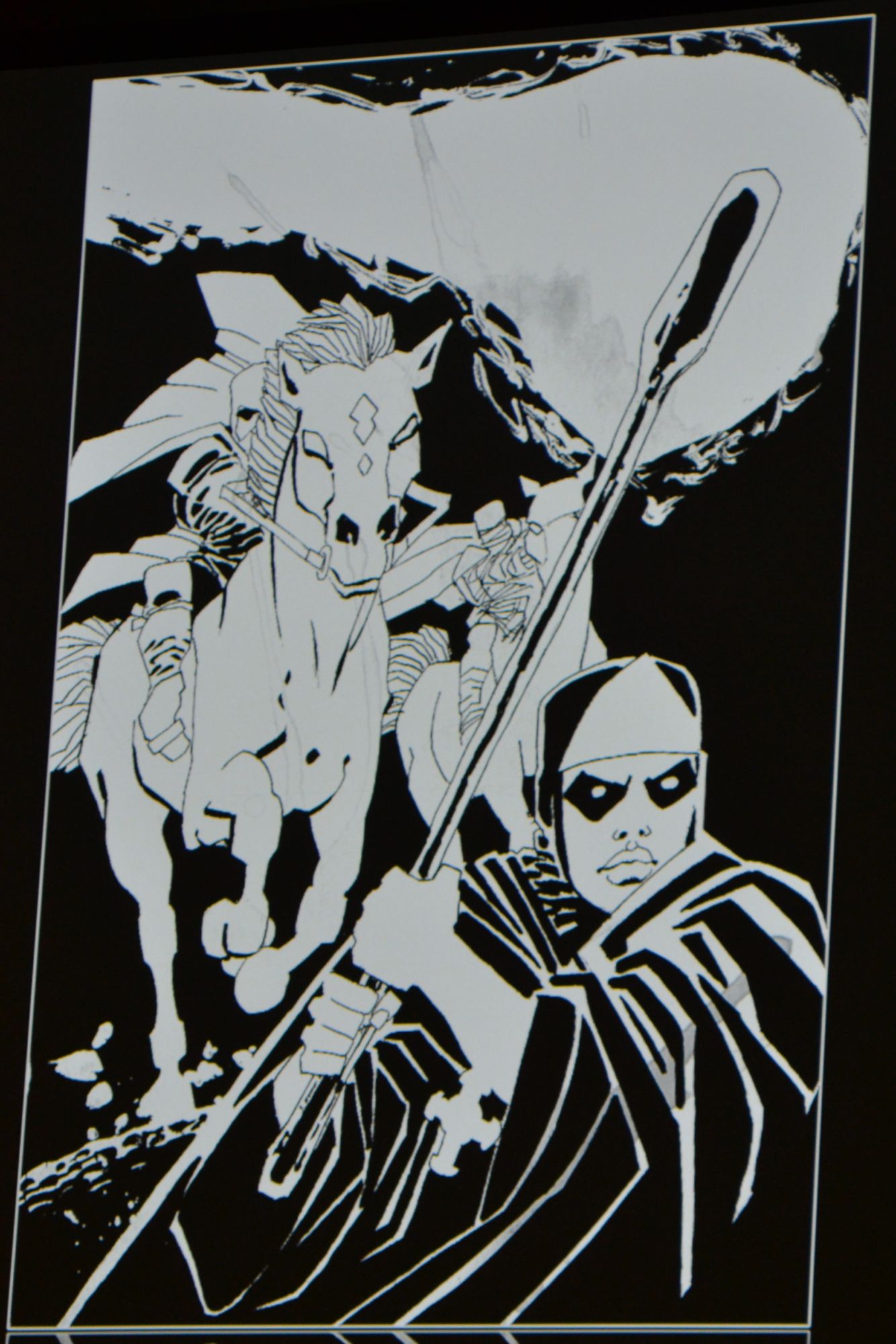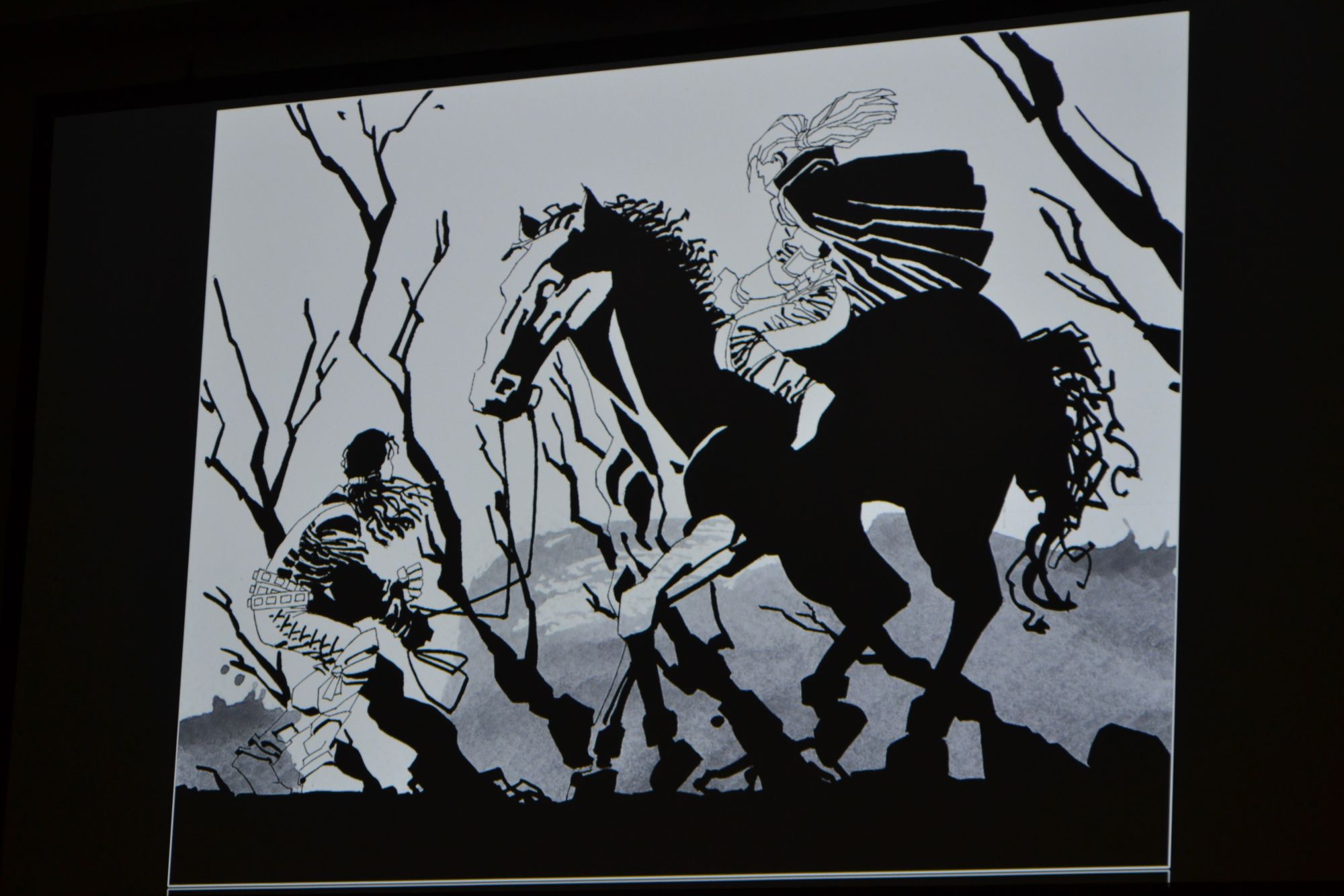 According to the panel, the show's visual style is strongly based on Miller's art for the book – with many of Miller's book illustrations on display for the SDCC audience. Mostly in black and white, the art has a geometric aspect – brutal with its hard edges and stark contrasts between dark and light. The few colored pieces that were shown feel like animated stills. The colors are bright, and the characters are in action, fighting, hiding, or speaking. Miller's dark artistic style is evident throughout. During the panel, Miller and Fuentes pointed out that despite the young adult audience, they wanted to focus on the hard, dark realities of the Middle Ages.