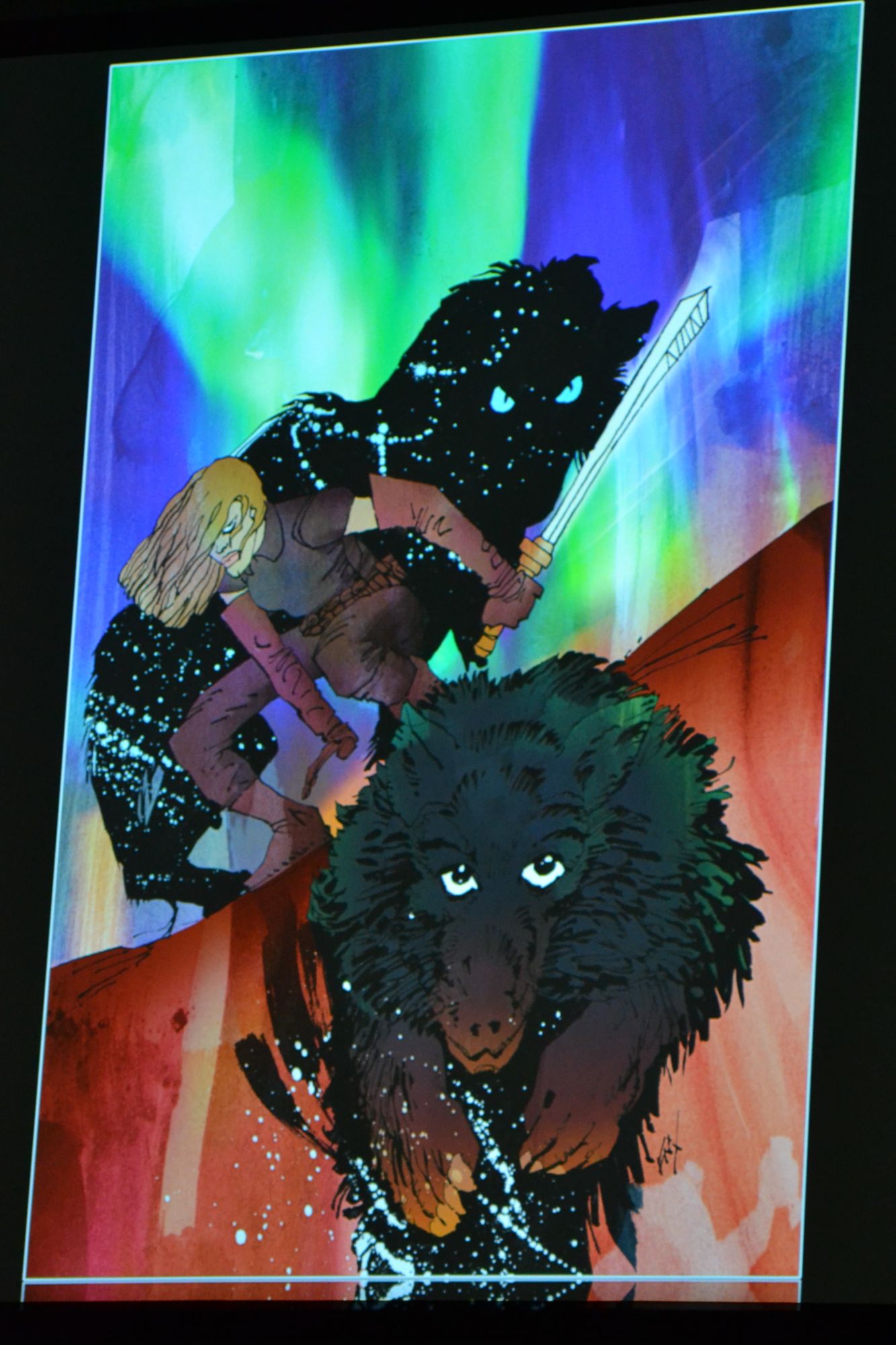 Zetna Fuentes, who directed and executive produced the first two episodes of the series, moderated the panel. All three discussed the story of Cursed and its unusual development. Unlike most television show adaptations, Fuentes didn't have a completed body of work on which to base the show. Wheeler was still writing the novel as Fuentes developed the series. As such, many of the design decisions were made as a group, with Miller acting as an art director. Despite the fantasy elements of the story, Fuentes and Wheeler want the background to be true to Middle Ages/Pre-Roman England – with costumes, sets, and scripts analyzed with the setting and time period in mind.