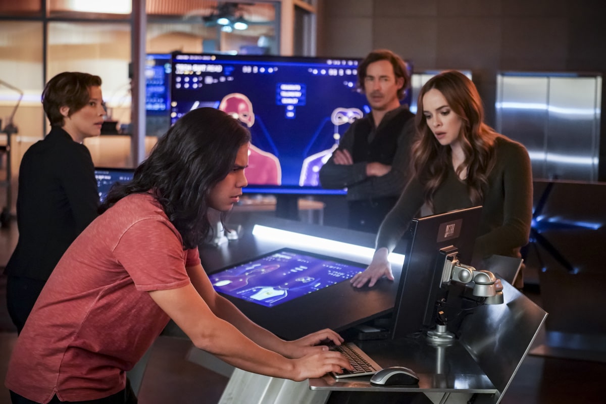 - The Flash — "King Shark vs. Gorilla Grodd" — Image Number: FLA515b_0129b.jpg — Pictured (L-R): Audrey Marie Anderson as Lyla Michaels, Carlos Valdes as Cisco Ramon, Tom Cavanagh as Sherloque Wells and Danielle Panabaker as Caitlin Snow — Photo: Shane Harvey/The CW — é 2019 The CW Network, LLC. All rights reserved