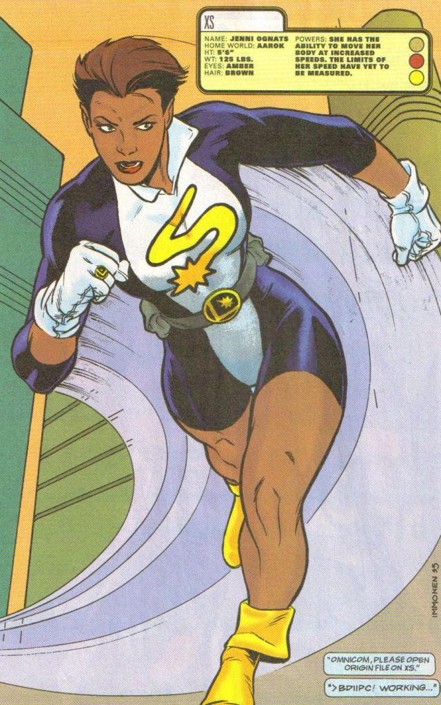 The padding on the shoulders and the way the top seals are completely different. This is a completely different suit that Cisco (Carlos Valdes) or someone will have had to make. But the real fascinating thing here is who the costume looks like. At least to me, it appears to be how the Arrowverse would do the costume of the Legionnaire named XS, aka Jenni Ognats, Barry and Iris's granddaughter from the comic books.