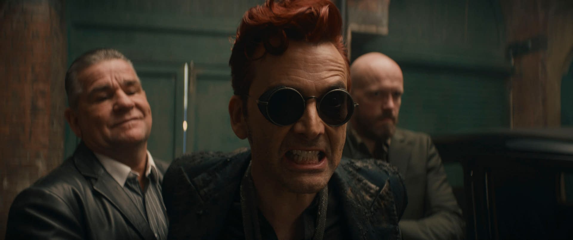 Now that we know that the third and final chapter of Prime Video's David Tennant and Michael Sheen-starring adaptation of Neil Gaiman and the late Sir Terry Pratchett's Good Omens is set to hit screens on May 13th, we're beginning to get some very interesting looks at what's to come. For example, a new image released earlier today shows Crowley (Tennant) very much not in a good mood while being detained (and looking a bit dusty, we might add). Here's a look: