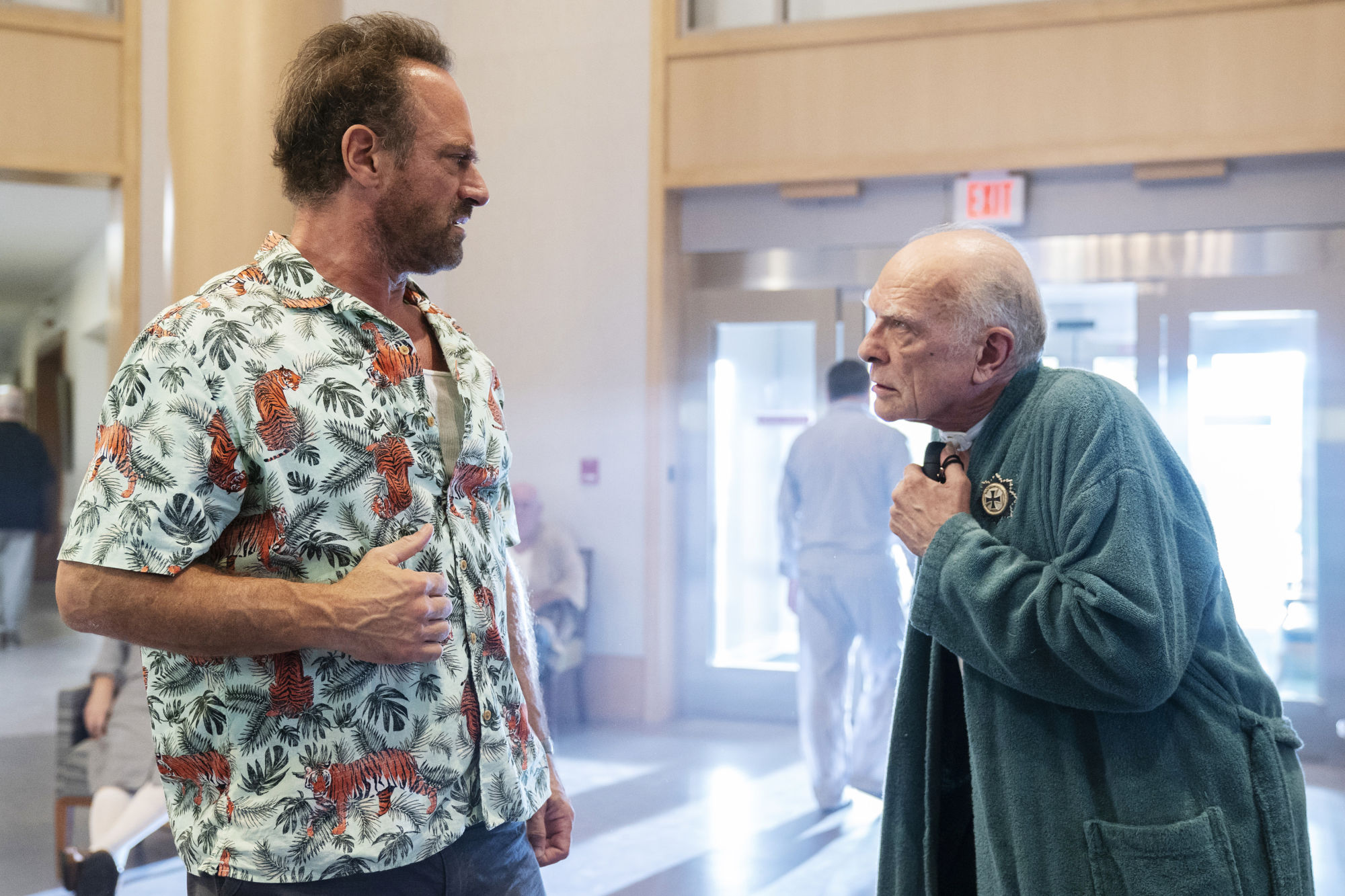 - HAPPY! — "Blitzkrieg!!!" Episode 204 — Pictured: (l-r) Chris Meloni as Nick Sax, Patton Oswald as Happy! — (Photo by: SYFY)
