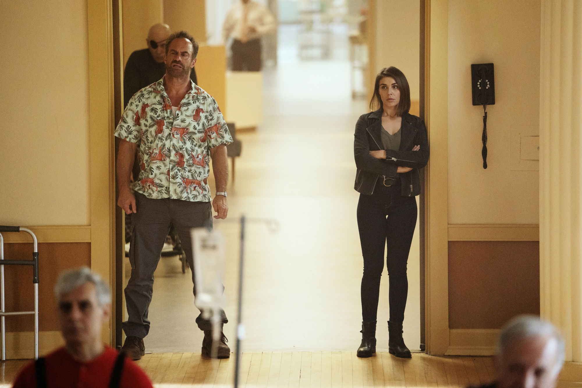 - HAPPY! — "Blitzkrieg!!!" Episode 204 — Pictured: (l-r) Chris Meloni as Nick Sax, Lili Mirojnick as Detective Meredith McCarthy — (Photo by: Peter Kramer/SYFY)