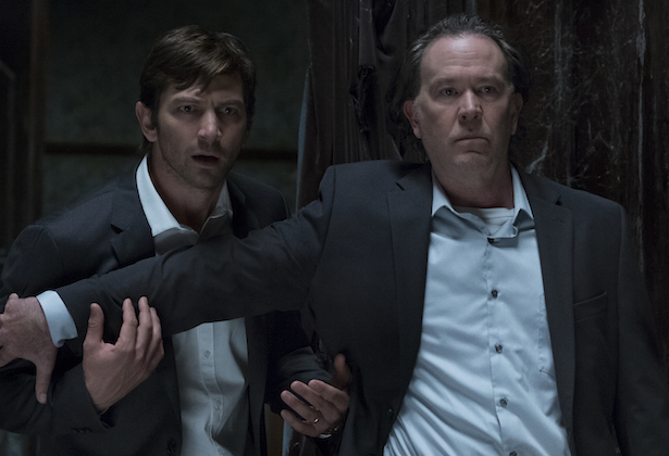 Netflix is unleashing first-looks at The Haunting of Hill House, the streaming service's series adaptation of Shirley Jackson's classic horror novel starring Michiel Huisman (Game of Thrones), Carla Gugino (Watchmen), and Timothy Hutton (American Crime). Created and executive-produced by director Mike Flanagan (Hush, Oculus), the 10-episode gothic thriller is set to premiere on Friday, October 12 (so close but yet so far from a cool "Friday the 13th" tie-in).