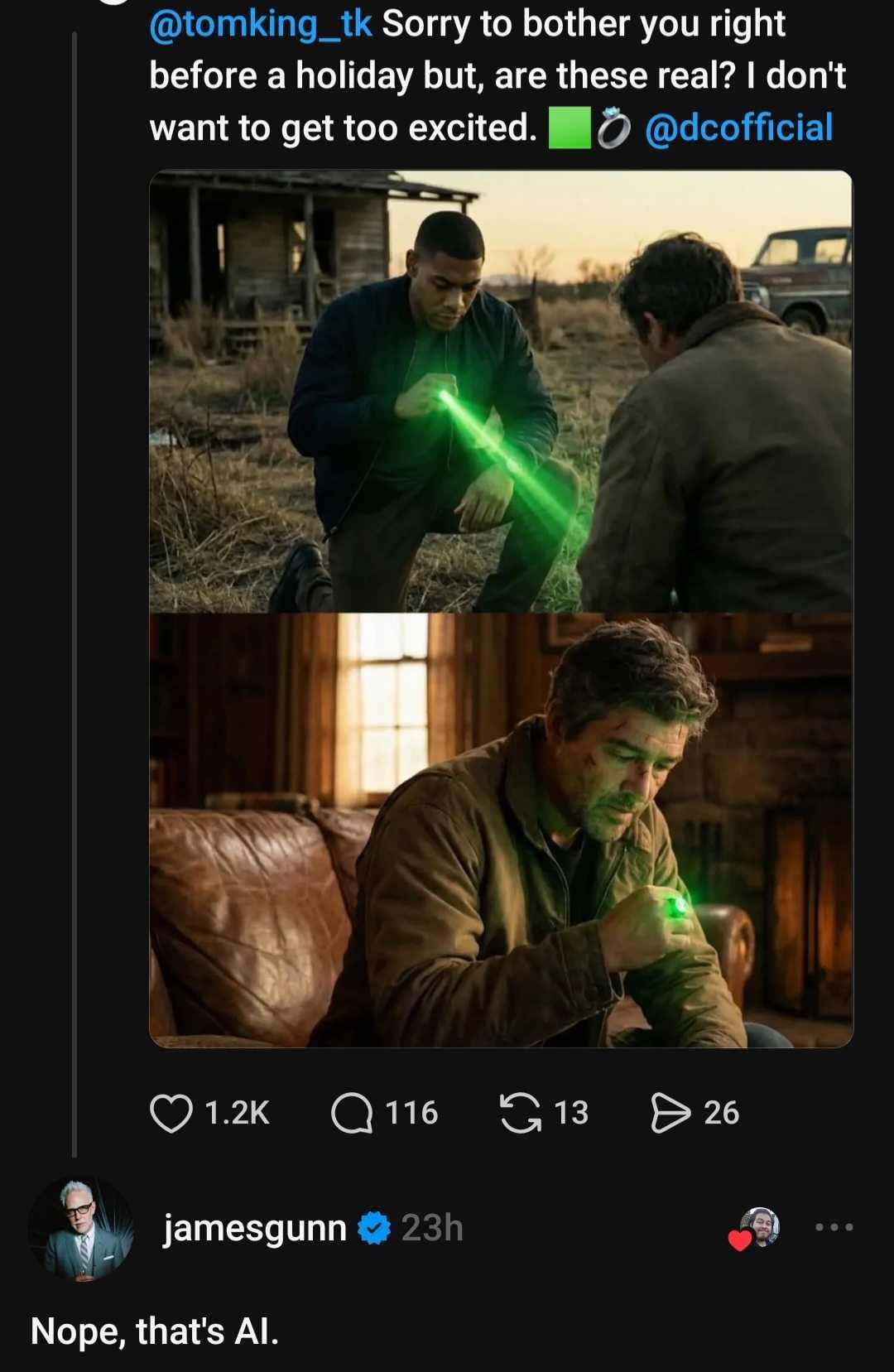 Asked if the images were real, Gunn kept the response direct, to the point, and without any wiggle room for it to be misinterpreted: "Nope, that's AI." Here's a screencap of the question and Gunn's response: