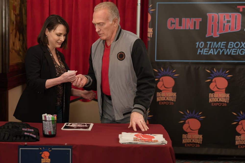 Don't worry! We're still going to have our regularly scheduled preview for tonight's episode dropping later today, but the fine folks over at NBCUniversal were kind enough to offer us a first-look clip from NBC's Law & Order: SVU, S27E18: "Gimmick" to pass along. When a sports and collectors fan event takes a deadly turn, Olivia (Mariska Hargitay) and the squad take a deep dive down the rabbit hole of professional fighting. In the clip below (included with our overall episode preview), Olivia, Jake (Corey Cott), and Amanda (Kelli Giddish) look for answers at the NY Knockout Expo – where Jake's fanboying catches Olivia off guard.