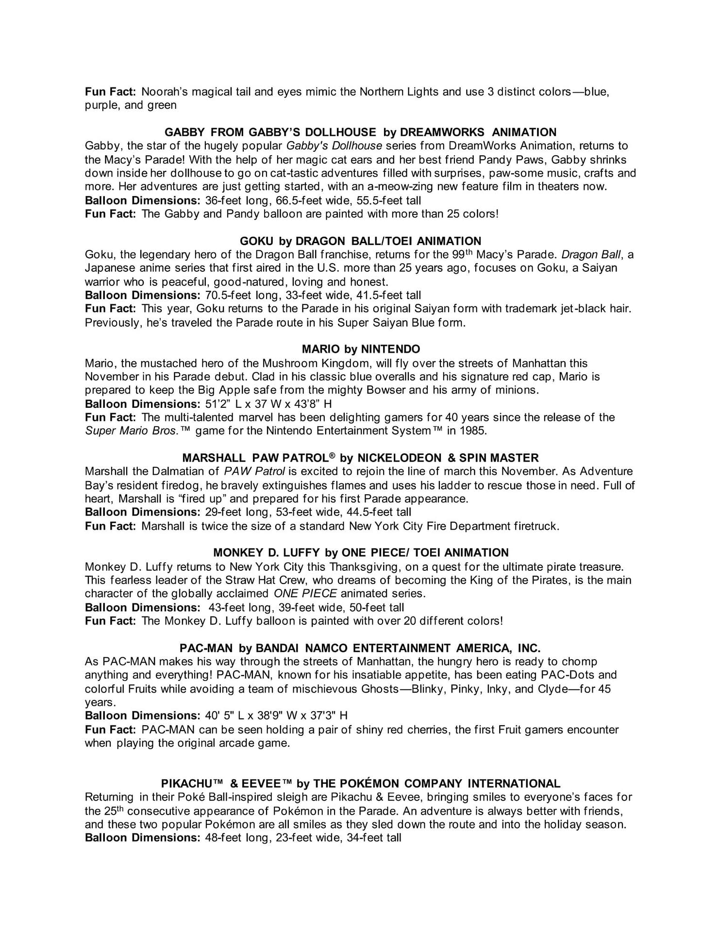 This year, four new featured character balloons will debut, including Buzz Lightyear by Pixar Animation Studios; Pac-Man by Bandai Namco Entertainment America, Inc.; Shrek's Onion Carriage from Universal Pictures' DreamWorks Animation; and Mario by Nintendo. Additionally, Derpy Tiger and Sussie from Netflix's K-Pop Demon Hunters will join the line-up as a mid-sized balloon and balloonicle, respectively.