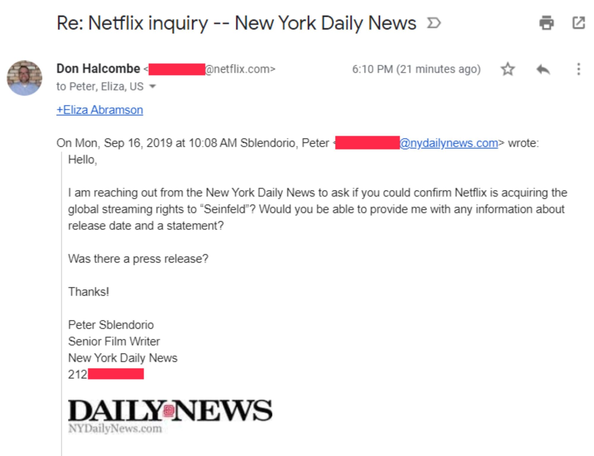 When the New York Daily News' Enquiry About Netflix and Seinfeld Went A Little Wider Than They Anticipated