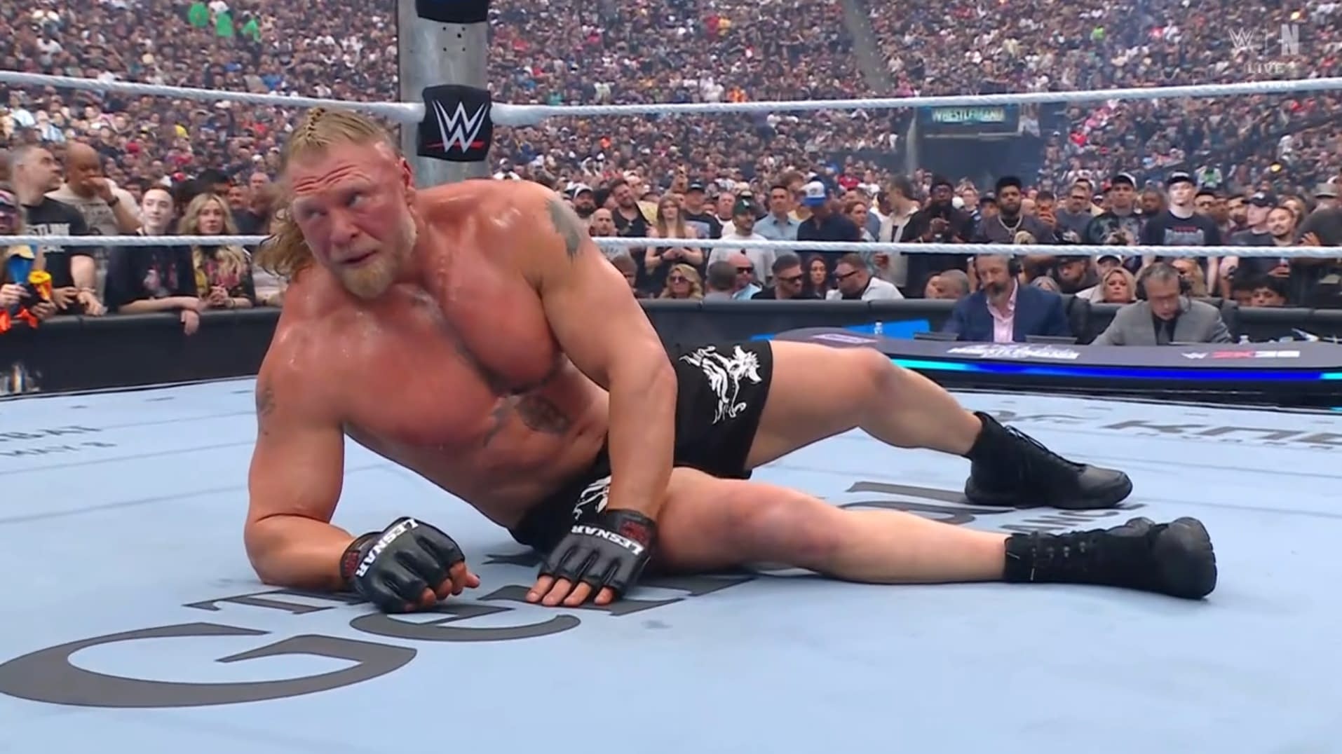 - Brock Lesnar appears defeated on the mat after his match with Oba Femi at WrestleMania.