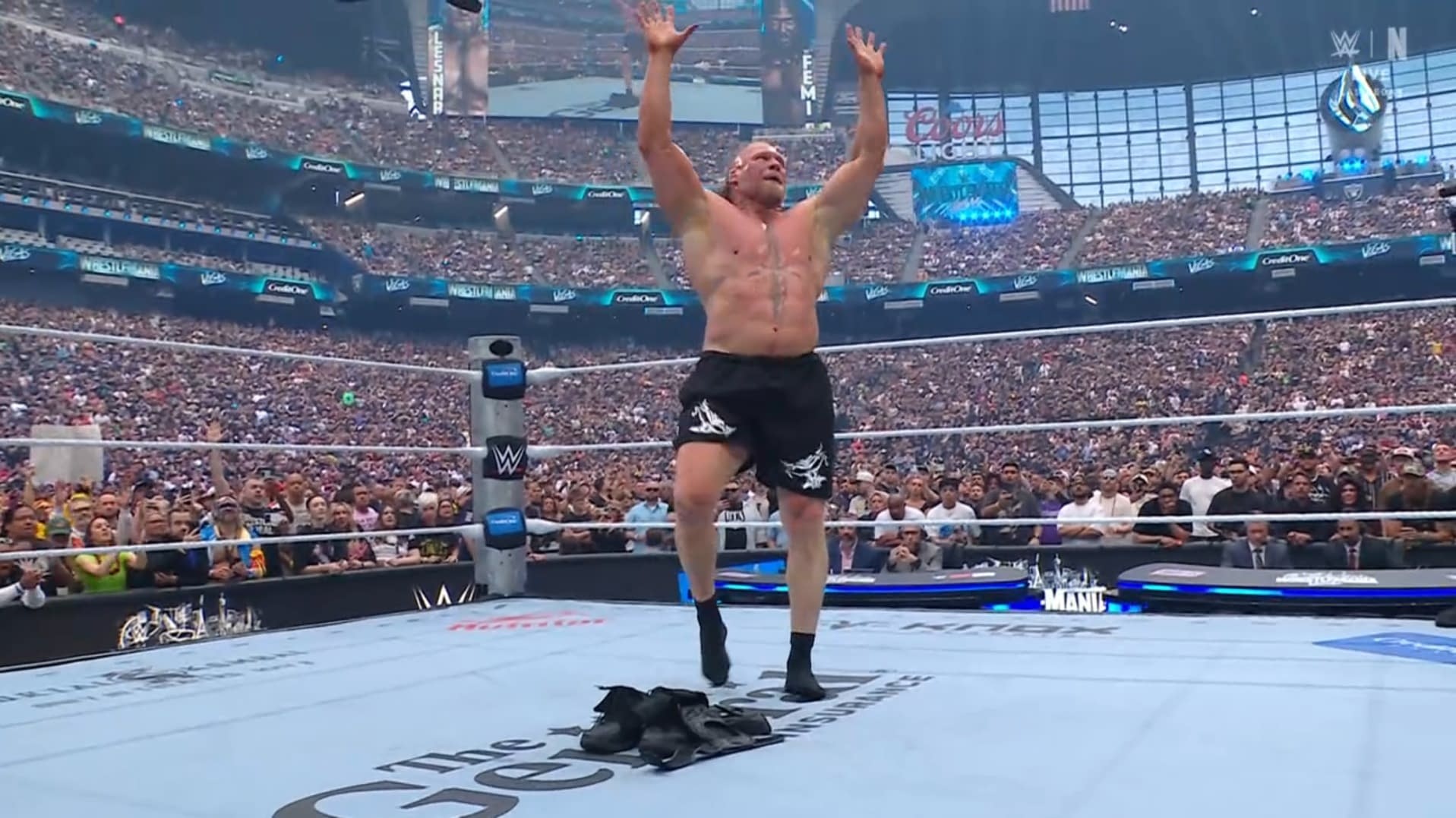 - Brock Lesnar raises his arms in the ring after his match at WrestleMania, after laying his gear in the ring.