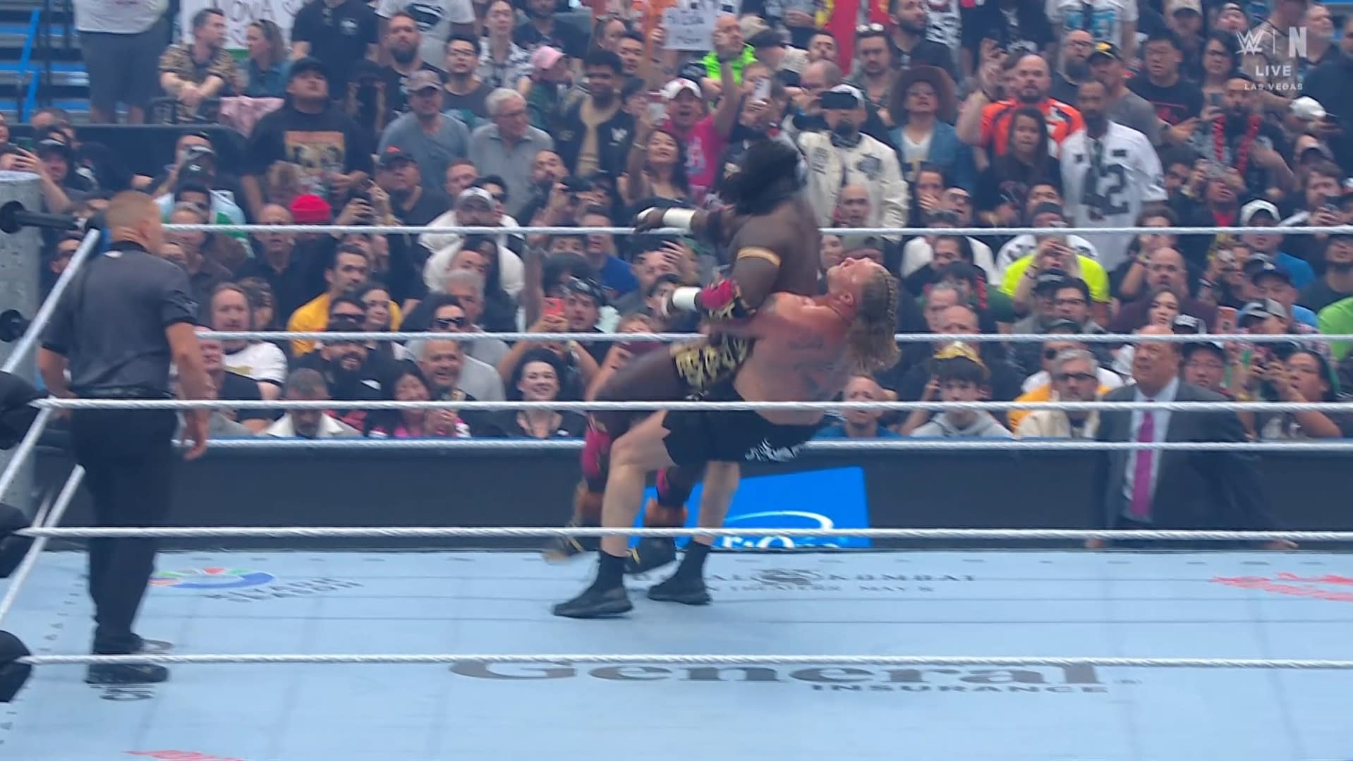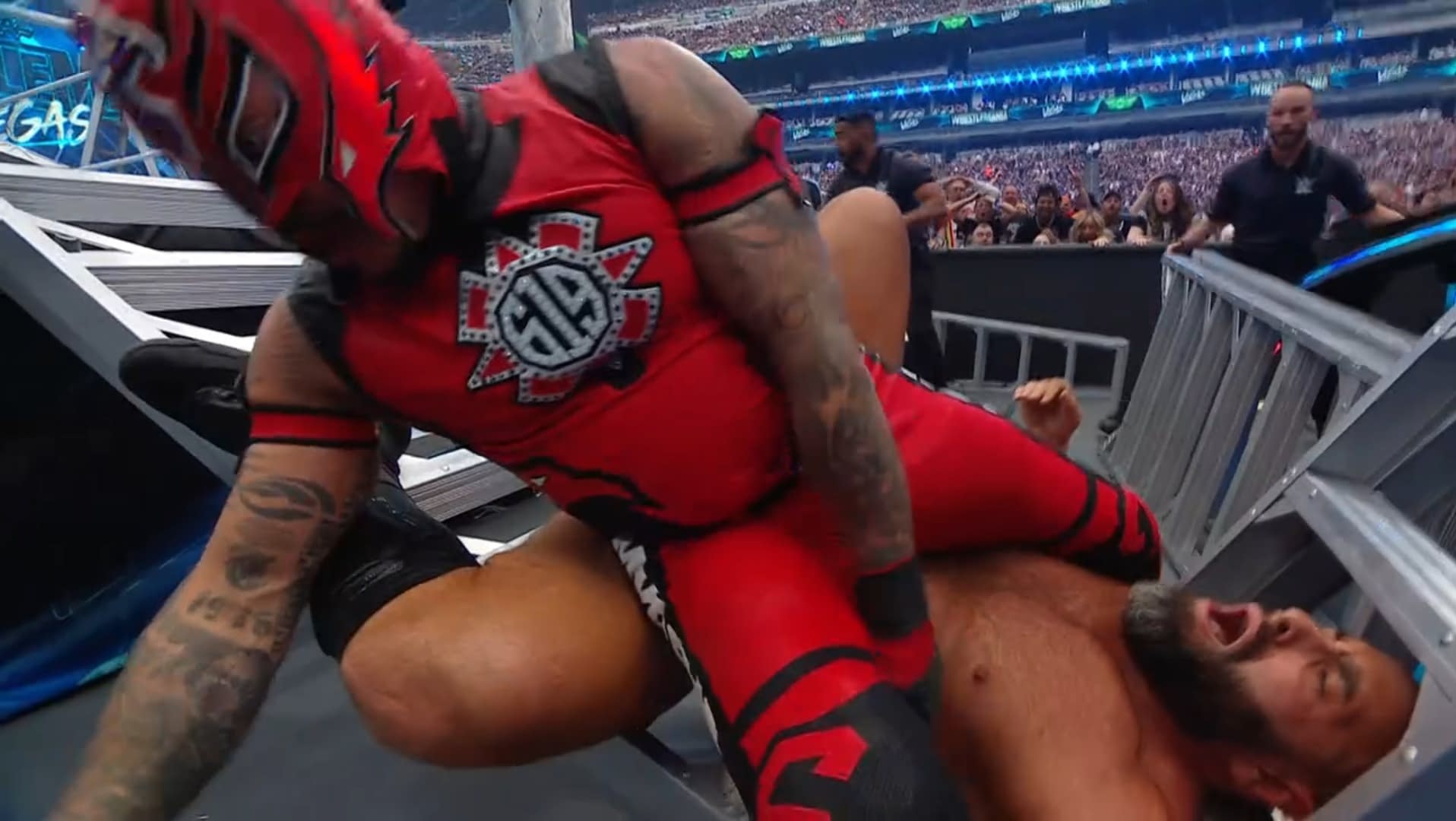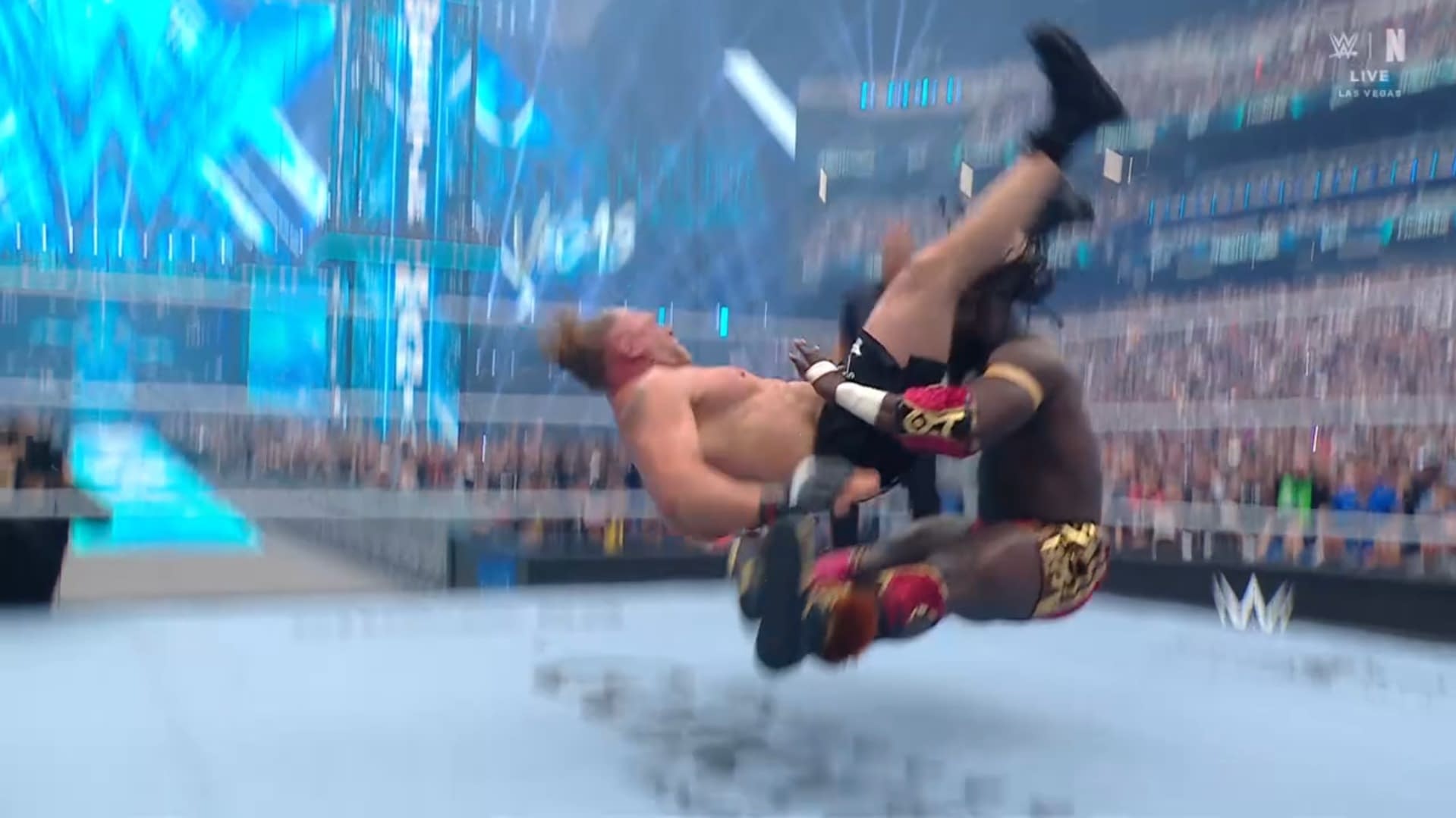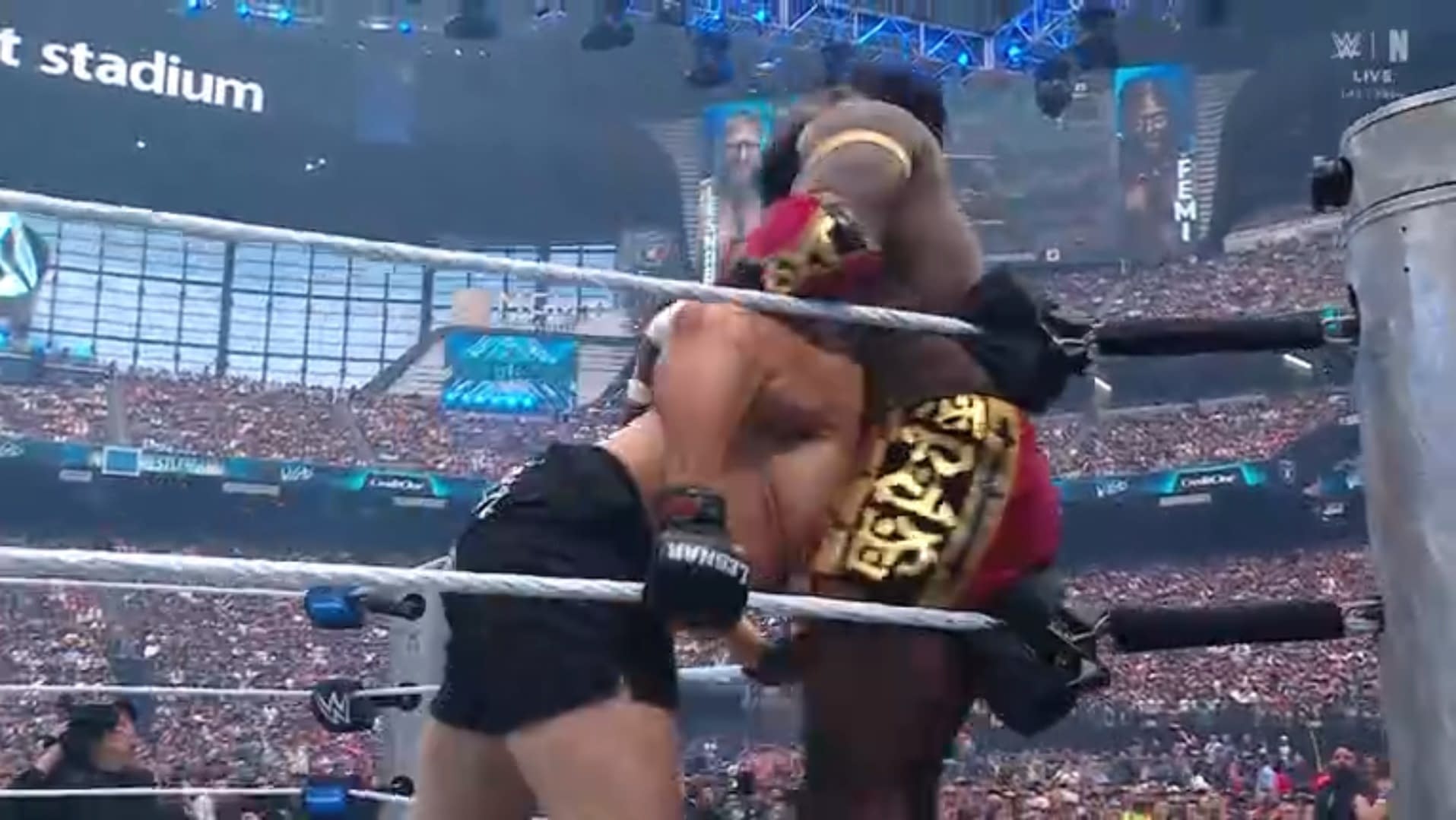 - Brock Lesnar thrusts his shoulder into Oba Femi at WrestleMania.