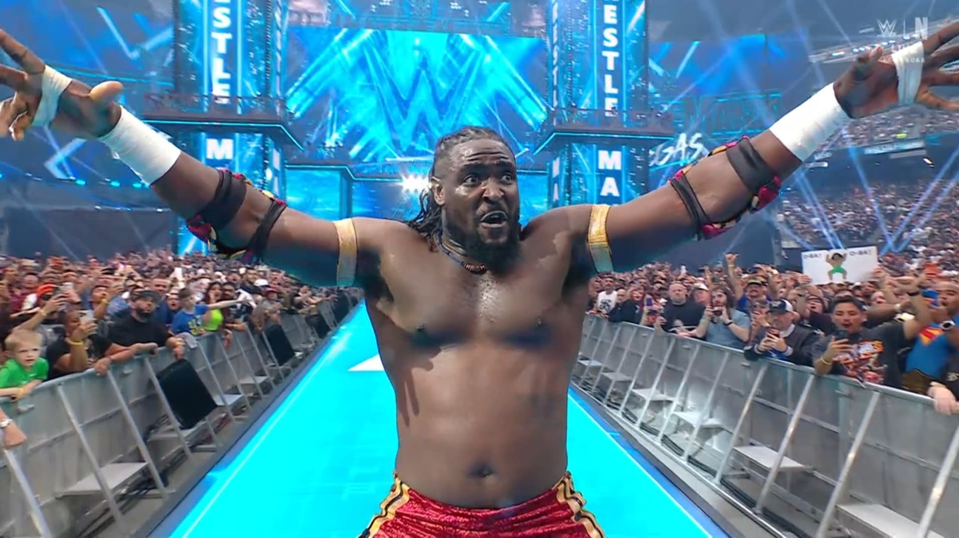 - Oba Femi celebrates his victory over Brock Lesnar at WrestleMania.