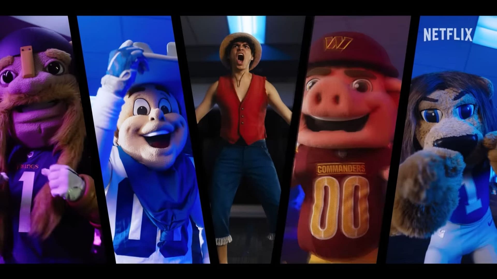 There's nothing like Christmas to bring a little holiday corporate synergy. For example, Netflix has its big NFL Christmas Gameday this Thursday, with the Dallas Cowboys taking on the Washington Commanders, and the Detroit Lions taking on the Minnesota Vikings. Netflix also has Iñaki Godoy (Monkey D. Luffy), Mackenyu Arata (Zoro), Emily Rudd (Nami), Jacob Romero Gibson (Usopp), and Taz Skylar (Sanji)-starring One Piece: Into the Grand Line, debuting in March. Why not bring the two together? That's exactly what the streaming service did, with Monkey D. Luffy on hand to motivate the teams' mascots ahead of the big day.